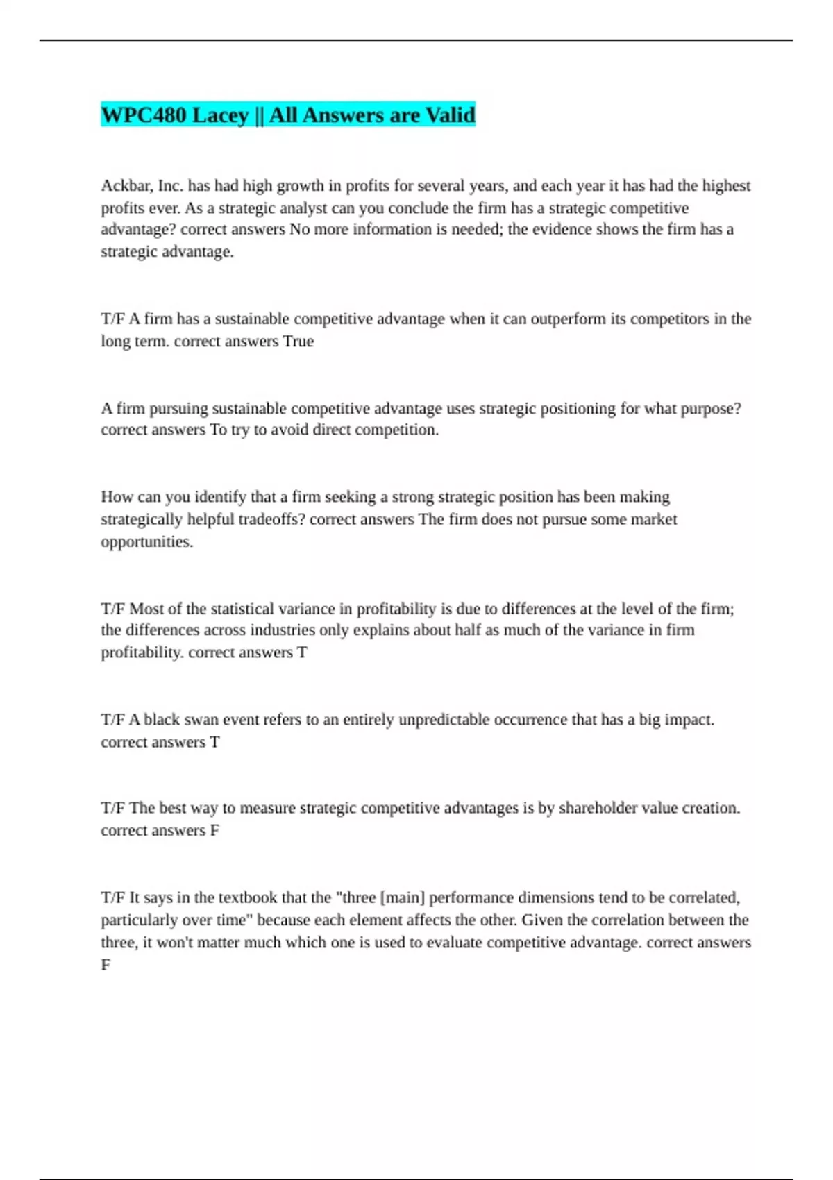 Ackbar, Inc. has had high growth in profits for several years, and each year it has had the highest profits ever. As a strategic analyst can you conclude the firm has a strategic competitive advantage? correct answers No more information is needed; the evidence shows the firm has a strategic advantage. T/F A firm has a sustainable competitive advantage when it can outperform its competitors in the long term. correct answers True A firm pursuing sustainable competitive advantage uses strategic positioning for what purpose? correct answers To try to avoid direct competition. How can you identify that a firm seeking a strong strategic position has been making strategically helpful tradeoffs? correct answers The firm does not pursue some market opportunities. T/F Most of the statistical variance in profitability is due to differences at the level of the firm; the differences across industries only explains about half as much of the variance in firm profitability. correct answers T T/F A black swan event refers to an entirely unpredictable occurrence that has a big impact. correct answers T T/F The best way to measure strategic competitive advantages is by shareholder value creation. correct answers F T/F It says in the textbook that the "three [main] performance dimensions tend to be correlated, particularly over time" because each element affects the other. Given the correlation between the three, it won't matter much which one is used to evaluate competitive advantage. correct answers F