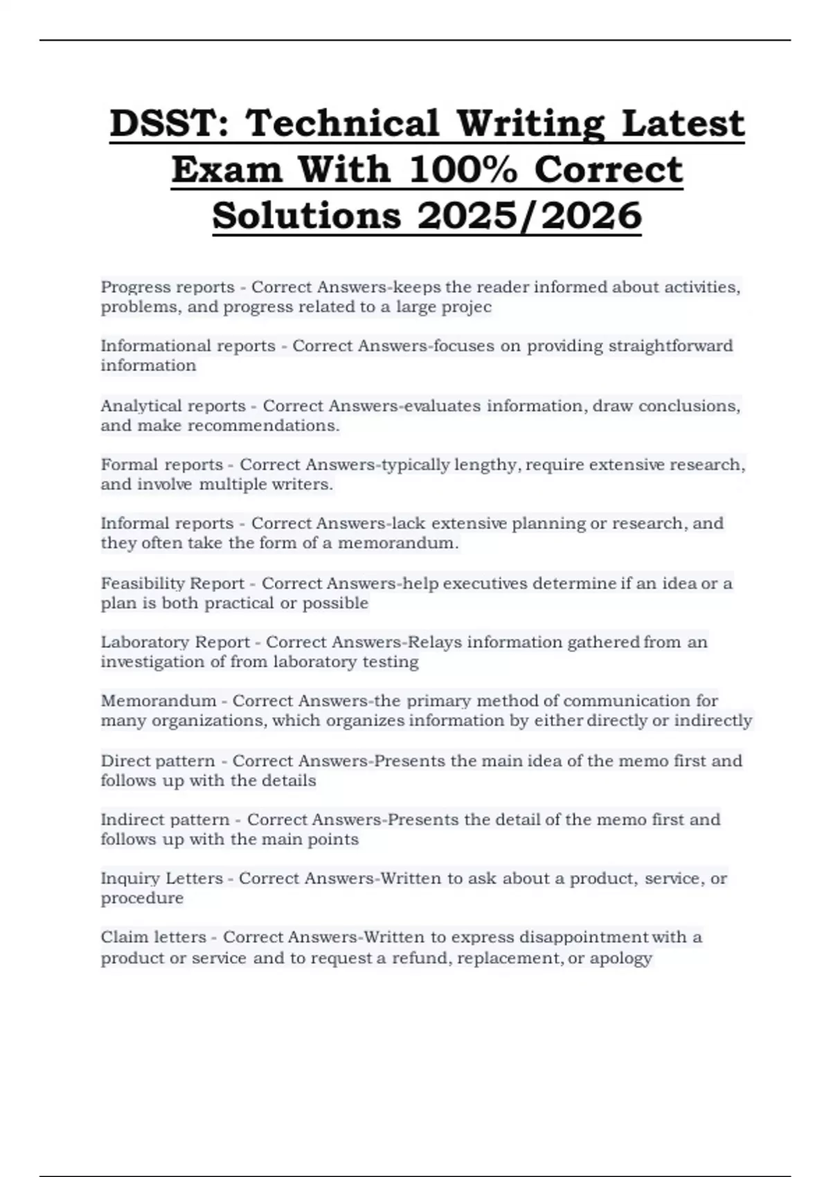 DSST: Technical Writing – Latest Exam with 100% Correct Solutions (2025/2026) – Verified Question Set with Accurate Answers This document contains the latest version of the DSST Technical Writing exam for the 2025/2026 academic year, featuring 100% correct and verified solutions. It includes a complete collection of exam-style multiple-choice questions covering all major technical writing topics, such as document design, audience analysis, grammar and style, formatting, and editing practices. Ideal for thorough preparation and self-assessment before taking the official DSST exam.