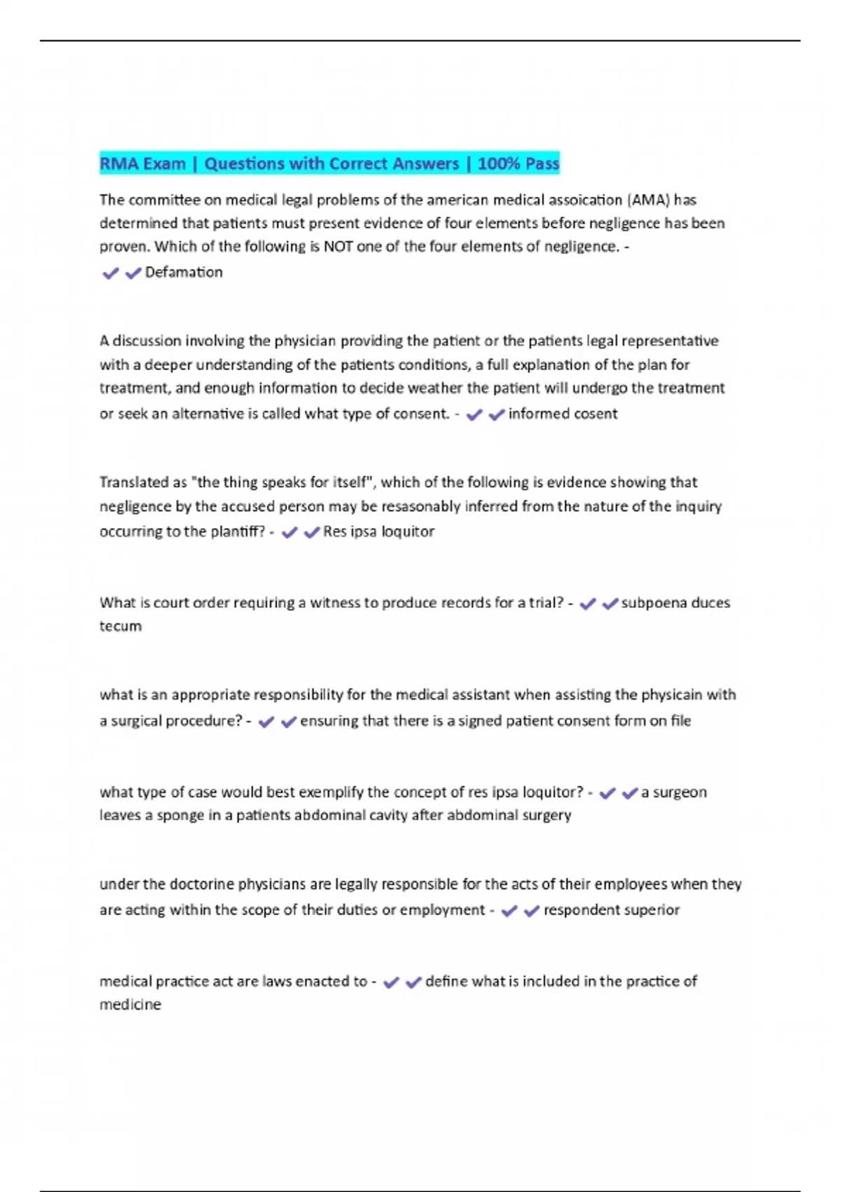 RMA Exam | Questions with Correct Answers | 100% Pass