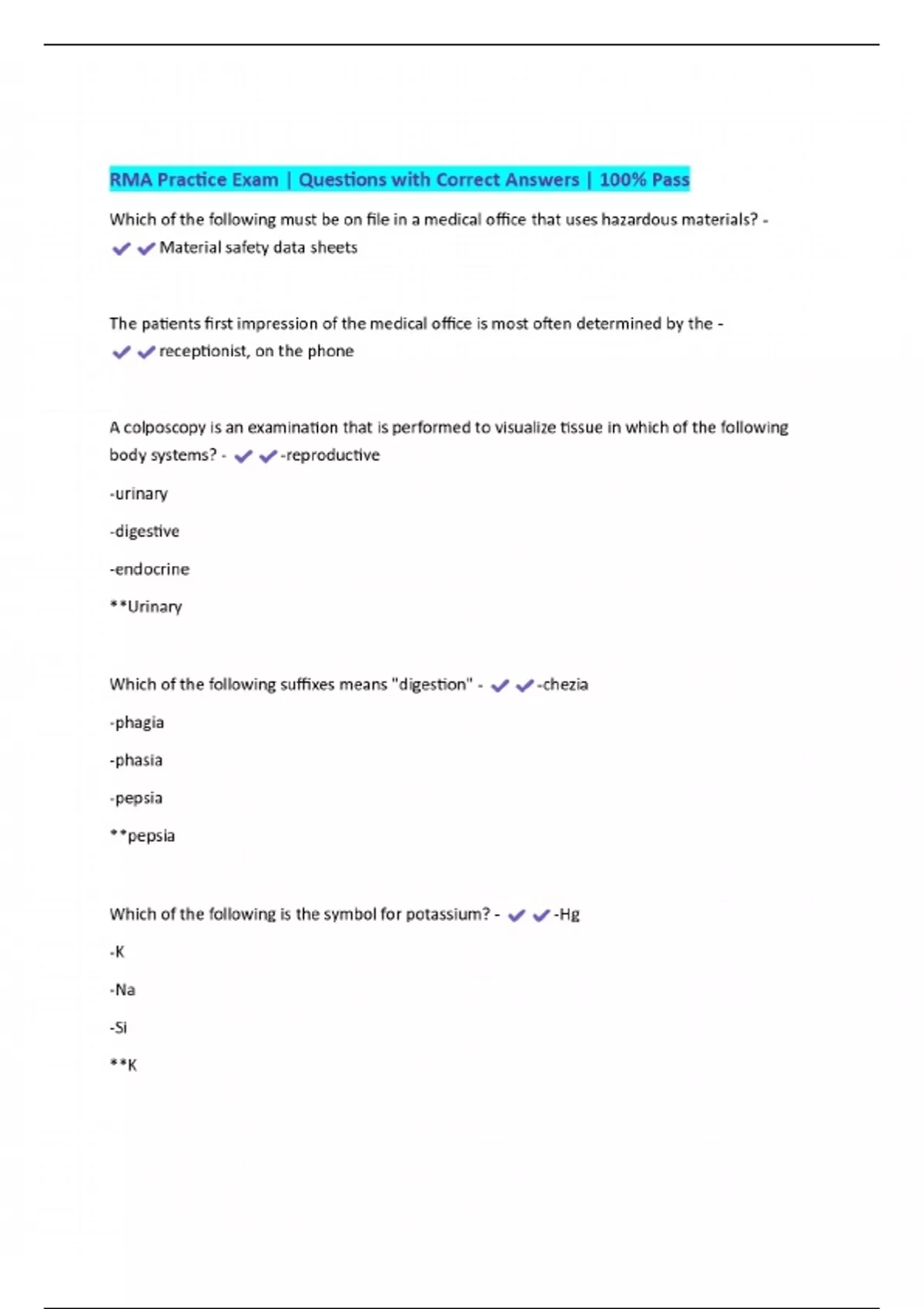RMA Practice Exam | Questions with Correct Answers | 100% Pass
