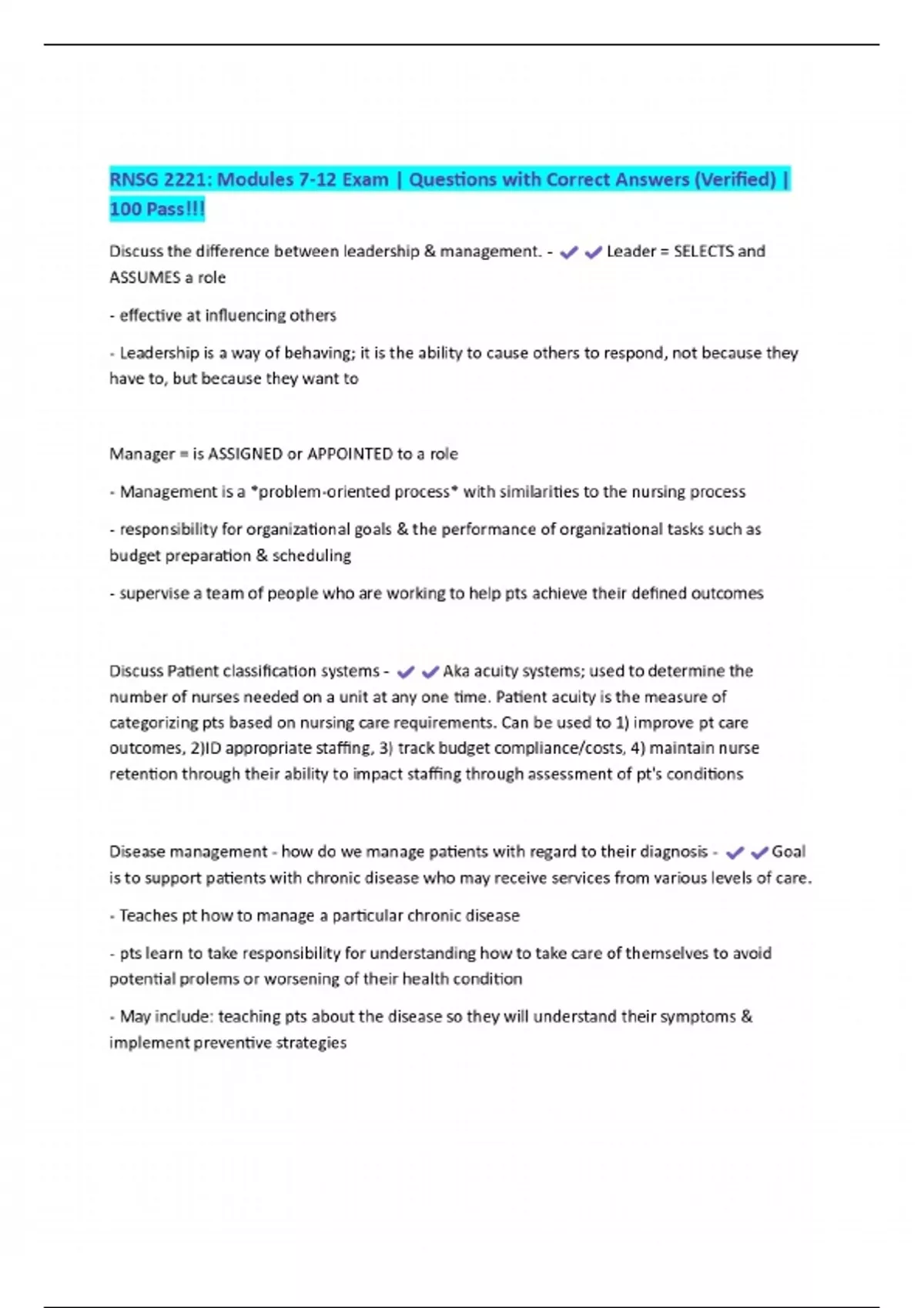 RNSG 2221: Modules 7-12 Exam | Questions with Correct Answers (Verified) | 100 Pass!!!