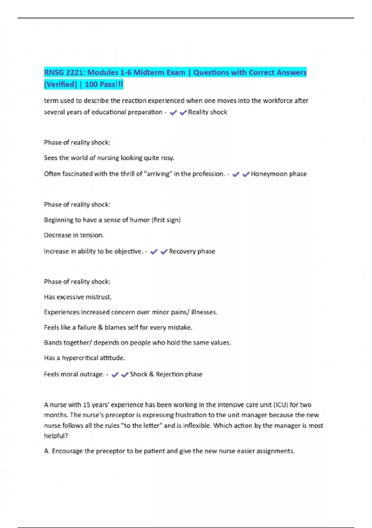 RNSG 2221: Modules 1-6 Midterm Exam | Questions with Correct Answers (Verified) | 100 Pass!!!