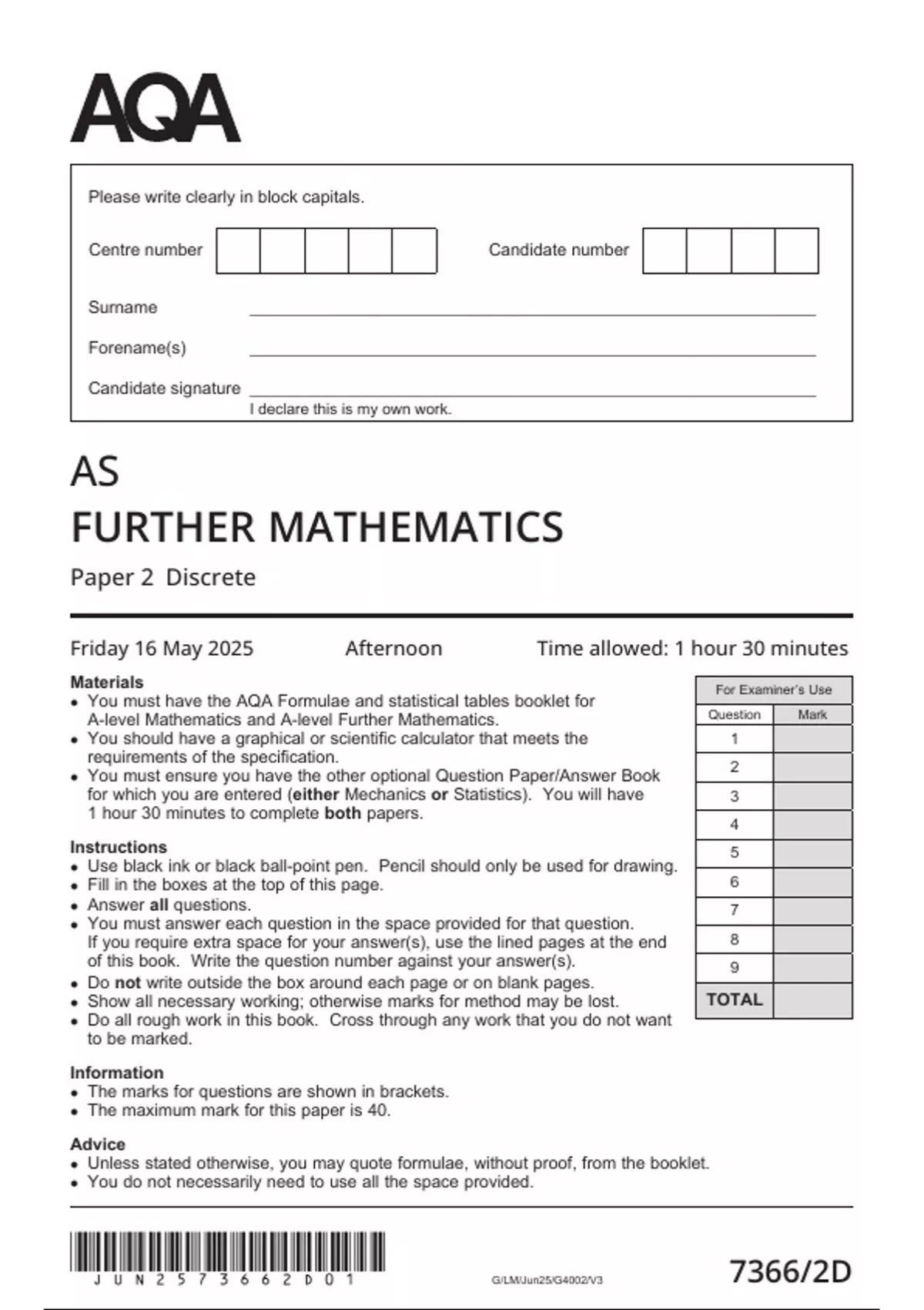 l The maximum mark for this paper is 40.