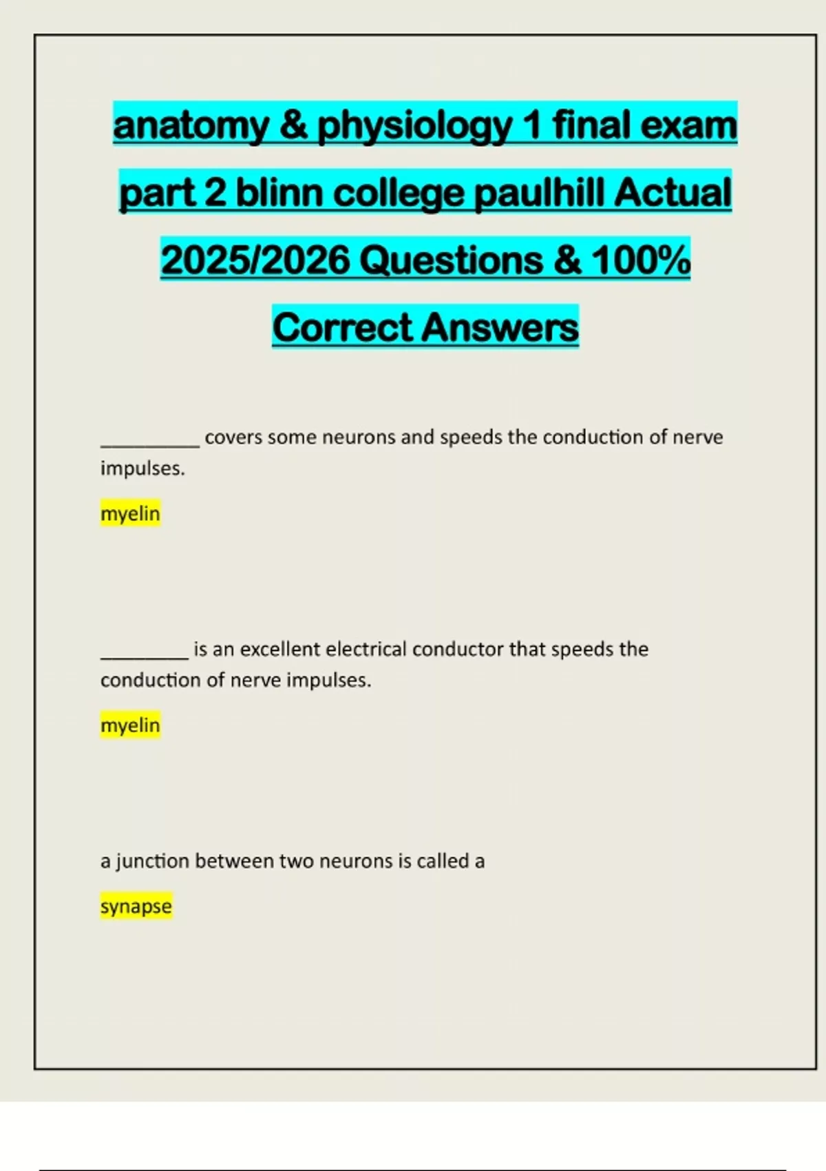 anatomy & physiology 1 final exam part 2 blinn college paulhill Actual 2025/2026 Questions & 100% Correct Answers _________ covers some neurons and speeds the conduction of nerve impulses. myelin ________ is an excellent electrical conductor that speeds the conduction of nerve impulses. myelin a junction between two neurons is called a synapsethe somatic system includes - the sensory receptors that react to changes in the outside world. - the efferent neurons that signal the muscles to respond. - the afferent neurons that keep the CNS informed of those changes. the teeth are innervated by this nerve trigeminal how many vertebral nerves are in each part? cervical- 8 thoracic- 12 lumbar- 5 how many nerves are in spinal cord?