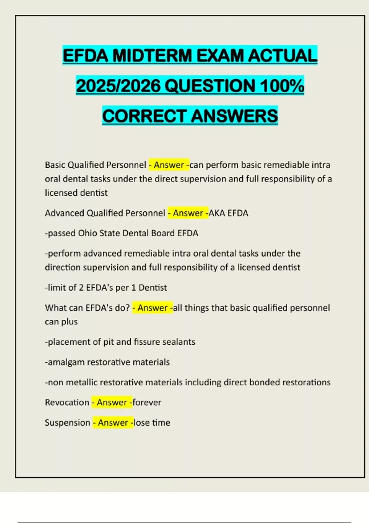 EFDA MIDTERM EXAM ACTUAL 2025/2026 QUESTION 100% CORRECT ANSWERS Basic Qualified Personnel - Answer -can perform basic remediable intra oral dental tasks under the direct supervision and full responsibility of a licensed dentist Advanced Qualified Personnel - Answer -AKA EFDA -passed Ohio State Dental Board EFDA -perform advanced remediable intra oral dental tasks under the direction supervision and full responsibility of a licensed dentist -limit of 2 EFDA's per 1 Dentist What can EFDA's do? - Answer -all things that basic qualified personnel can plus -placement of pit and fissure sealants -amalgam restorative materials -non metallic restorative materials including direct bonded restorations Revocation - Answer -forever Suspension - Answer -lose time-definite= specific amount of time -indefinite = until conditions met restriction - Answer -cannot do certain things; limited -can be permanent or temporary probation - Answer -on watch until become compliant again censure/reprimand - Answer -formal/public in writing* Universal Numbering System - Answer -identification of the teeth by numbering the permanent teeth 1-32 and lettering the primary teeth AT Federation Dentaire International system - Answer -is another method for numbering the teeth. a two digit code that identifies the quadrant and the tooth -first number represents a quadrant -second number represents a tooth Anatomical crown - Answer -Portion of the tooth that extends from the incisal or occlusal surface to the CEJ CEJ - Answer -dictates the contour of the restoration placed in the area of the tooth clinical crown - Answer -the visible portion of the anatomical crown extending from the crest of the soft tissue and includes incisal/occlusal surface furrow - Answer -concavity coronal to the furcation that extends to or nearly to CEJ