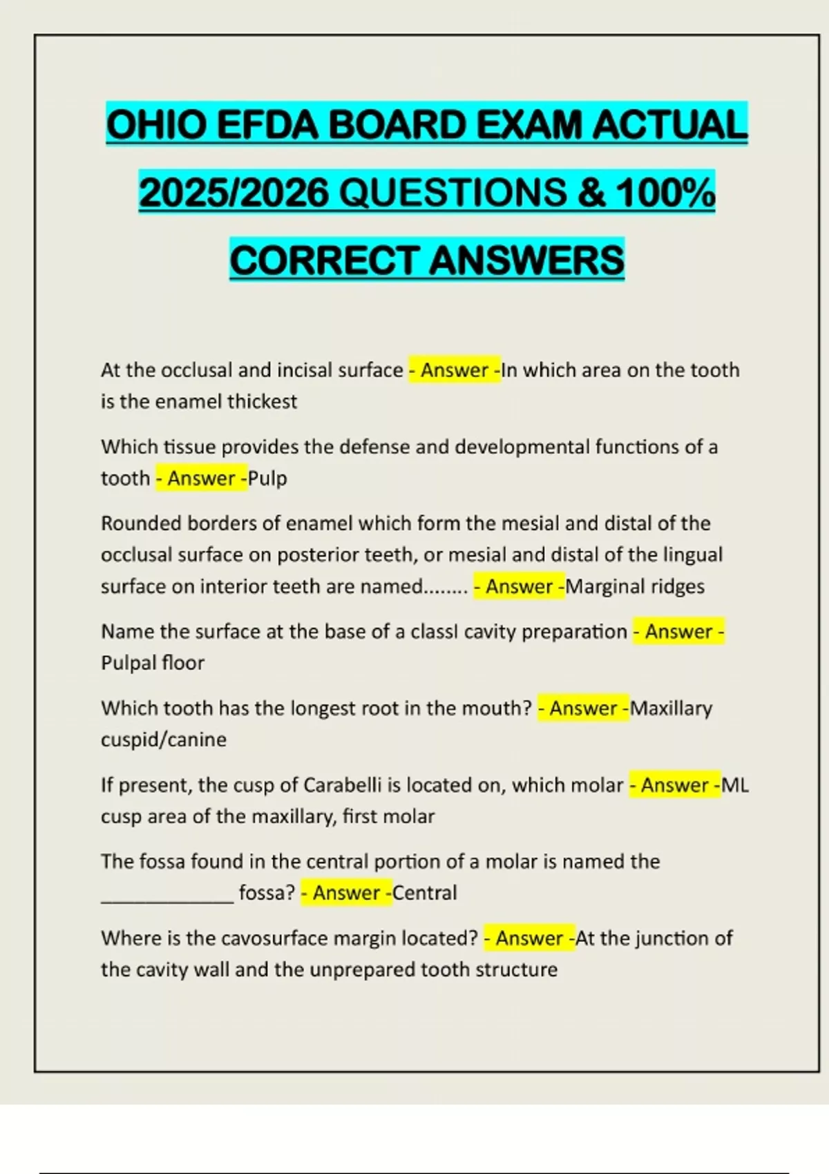 OHIO EFDA BOARD EXAM ACTUAL 2025/2026 QUESTIONS & 100% CORRECT ANSWERS At the occlusal and incisal surface - Answer -In which area on the tooth is the enamel thickest Which tissue provides the defense and developmental functions of a tooth - Answer -Pulp Rounded borders of enamel which form the mesial and distal of the occlusal surface on posterior teeth, or mesial and distal of the lingual surface on interior teeth are named........ - Answer -Marginal ridges Name the surface at the base of a classI cavity preparation - Answer - Pulpal floor Which tooth has the longest root in the mouth? - Answer -Maxillary cuspid/canine If present, the cusp of Carabelli is located on, which molar - Answer -ML cusp area of the maxillary, first molar The fossa found in the central portion of a molar is named the ____________ fossa? - Answer -Central Where is the cavosurface margin located? - Answer -At the junction of the cavity wall and the unprepared tooth structureIf the pulp receives an excessive stimulus, which type of dentin is formed in response - Answer -Reparative dentin What is the correct classification of caries for a carious lesion that is located on the proximal surface of tooth #8 - Answer -Class III In which direction does the oblique bridge travel across the occlusal surface of a maxillary molar? -