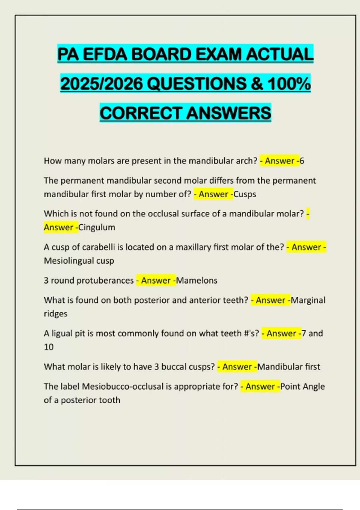 PA EFDA BOARD EXAM ACTUAL 2025/2026 QUESTIONS & 100% CORRECT ANSWERS How many molars are present in the mandibular arch? - Answer -6 The permanent mandibular second molar differs from the permanent mandibular first molar by number of? - Answer -Cusps Which is not found on the occlusal surface of a mandibular molar? - Answer -Cingulum A cusp of carabelli is located on a maxillary first molar of the? - Answer - Mesiolingual cusp 3 round protuberances - Answer -Mamelons What is found on both posterior and anterior teeth? - Answer -Marginal ridges A ligual pit is most commonly found on what teeth #'s? - Answer -7 and 10 What molar is likely to have 3 buccal cusps? - Answer -Mandibular first The label Mesiobucco-occlusal is appropriate for? - Answer -Point Angle of a posterior toothOn a maxillary first premolar what is the groove that sperates the buccal and lingual cusps? - Answer -Central groove The molar with a Y,H, or U pattern - Answer -Mandibular second premolar A facial and lingual triangular ridge join to form? - Answer -Transverse ridge Cusps for a mandibular first molar - Answer -mesiolingual, mesiofacial, distolingual, distofacial, distal Major difference between first and second molars? - Answer -1st molars has 5 cusps, 2nd molars have 4 cusps Which is true of oblique ridges? - Answer -Only Maxillary m