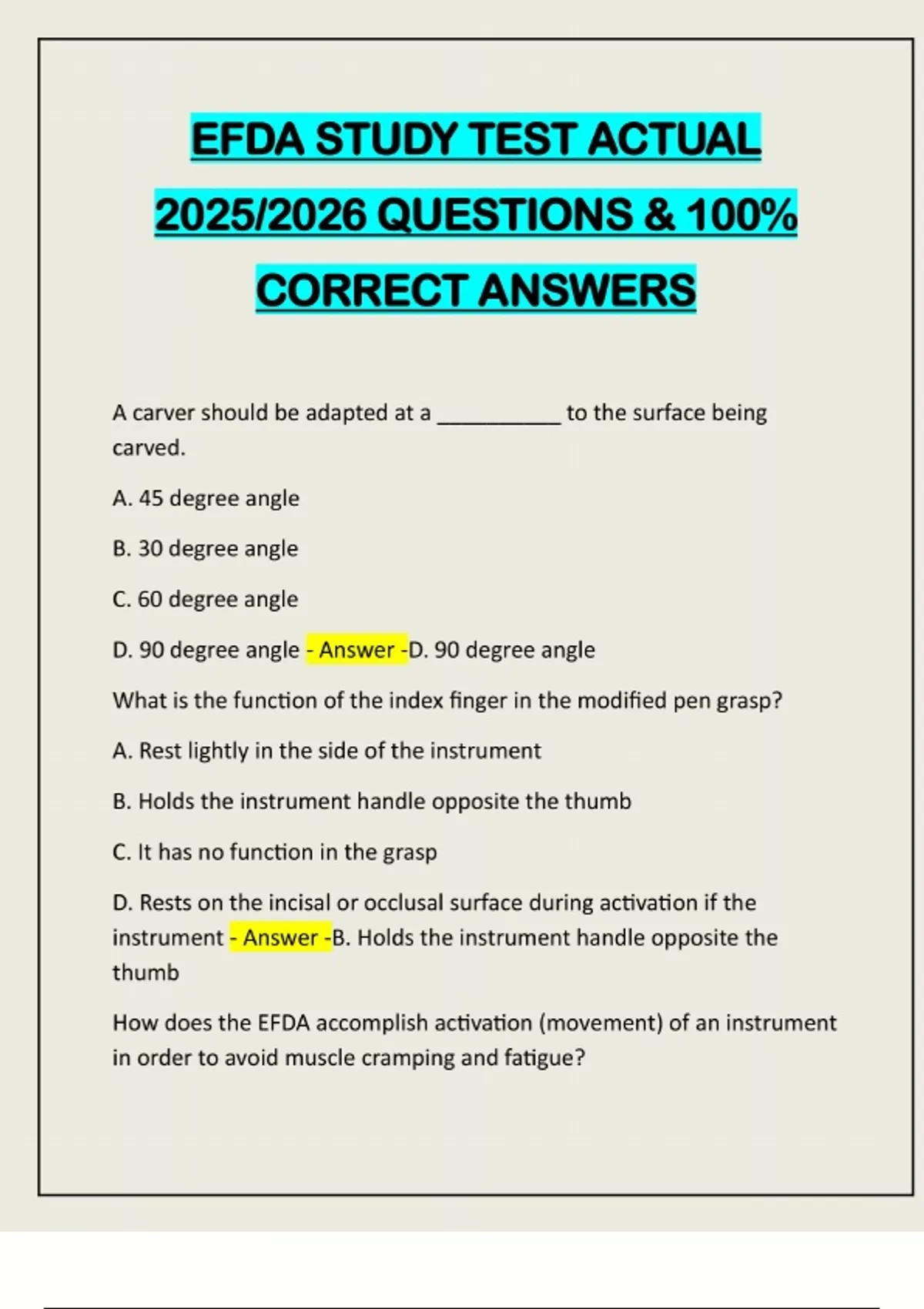 EFDA STUDY TEST ACTUAL 2025/2026 QUESTIONS & 100% CORRECT ANSWERS A carver should be adapted at a __________ to the surface being carved. A. 45 degree angle B. 30 degree angle C. 60 degree angle D. 90 degree angle - Answer -D. 90 degree angle What is the function of the index finger in the modified pen grasp? A. Rest lightly in the side of the instrument B. Holds the instrument handle opposite the thumb C. It has no function in the grasp D. Rests on the incisal or occlusal surface during activation if the instrument - Answer -B. Holds the instrument handle opposite the thumb How does the EFDA accomplish activation (movement) of an instrument in order to avoid muscle cramping and fatigue?A. Move the hand, wrist, and forearm as one unit B. Moving the hand, wrist, and forearm as one unit, keeping a secure fulcrum C. Flexing the fingers back and forth D. Flexing the fingers back and forth, keeping a secure fulcrum - Answer -B. Moving the hand, wirst, and forearm as one unit , keeping a secure fulrcum For best results of most operative procedures, it is important for he Efda to maintain complete: A. Retraction B. Protection C. Isolation D. Contamination - Answer -C. Isolation What method of isolation is recommended for short periods of time and is the oldest method used for moisture control? A. Cotton roll B. Dri angles C. Rubber dam D. High speed evacuation - Answer -A. Cotton rolls From the statements listed below, which statement is NOT a disadvantage of using cotton roll isolation? A. They become saturated easilyB. They protect against aspiration C. They offer limited retraction if lips and cheeks D. They need changed frequently - Answer -B. They protect against aspiration What form of isolation is considered ideal in operative procedures? A. Cotton roll B. Dri angles C. Rubber dam D. High speed evacuation - Answer -C. Rubber dam An EFDA is attempting to isolate an operating field in the oral cavity. Which method listed below is considered ideal? A. Gauze squares B. Dri angles C. Cotton rolls D. Rubber dam - Answer -D. Rubber dam What is a disadvantage of rubber dam isolation? A. Time consuming B. Limited retraction if lips and cheeks C. Limited protection against aspiration D. Limited protection of the patient and operator - Answer -A. Time consumin