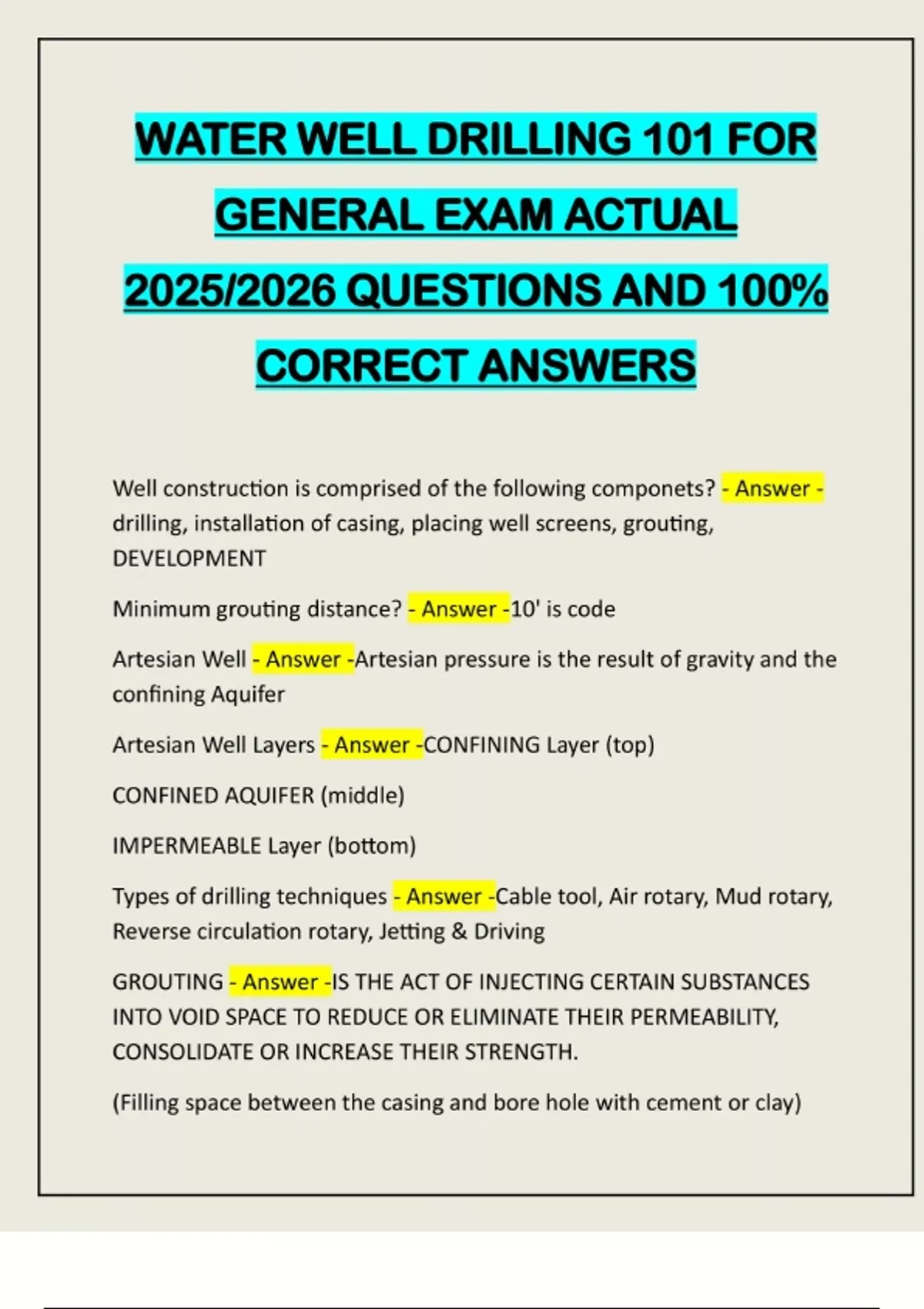 WATER WELL DRILLING 101 FOR GENERAL EXAM ACTUAL 2025/2026 QUESTIONS AND 100% CORRECT ANSWERS Well construction is comprised of the following componets? - Answer - drilling, installation of casing, placing well screens, grouting, DEVELOPMENT Minimum grouting distance? - Answer -10' is code Artesian Well - Answer -Artesian pressure is the result of gravity and the confining Aquifer Artesian Well Layers - Answer -CONFINING Layer (top) CONFINED AQUIFER (middle) IMPERMEABLE Layer (bottom) Types of drilling techniques - Answer -Cable tool, Air rotary, Mud rotary, Reverse circulation rotary, Jetting & Driving GROUTING - Answer -IS THE ACT OF INJECTING CERTAIN SUBSTANCES INTO VOID SPACE TO REDUCE OR ELIMINATE THEIR PERMEABILITY, CONSOLIDATE OR INCREASE THEIR STRENGTH. (Filling space between the casing and bore hole with cement or clay)Methods of Grouting include - Answer -Tremie pipe outside casing, Tremie pipe inside casing, Casing method or Halliburton method Neat Cement Ratio - Answer -Cement and Water, 5.5 to 6gal of h20 to 1 cubic foot of Portland cement with 3% bentonite to prevent shrinkage Tremie Pipe Outside Casing