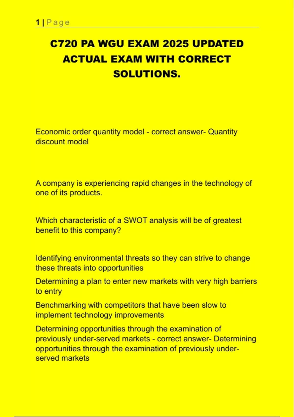 This document contains the complete and updated C720 Performance Assessment (Operations and Supply Chain Management) exam for Western Governors University (WGU) in 2025. It includes all actual exam questions along with correct answers, covering key topics such as SWOT analysis, Six Sigma, inventory systems, capacity planning, quality management philosophies, and supply chain strategies. It is a reliable resource for exam preparation and final review for students enrolled in the C720 course.