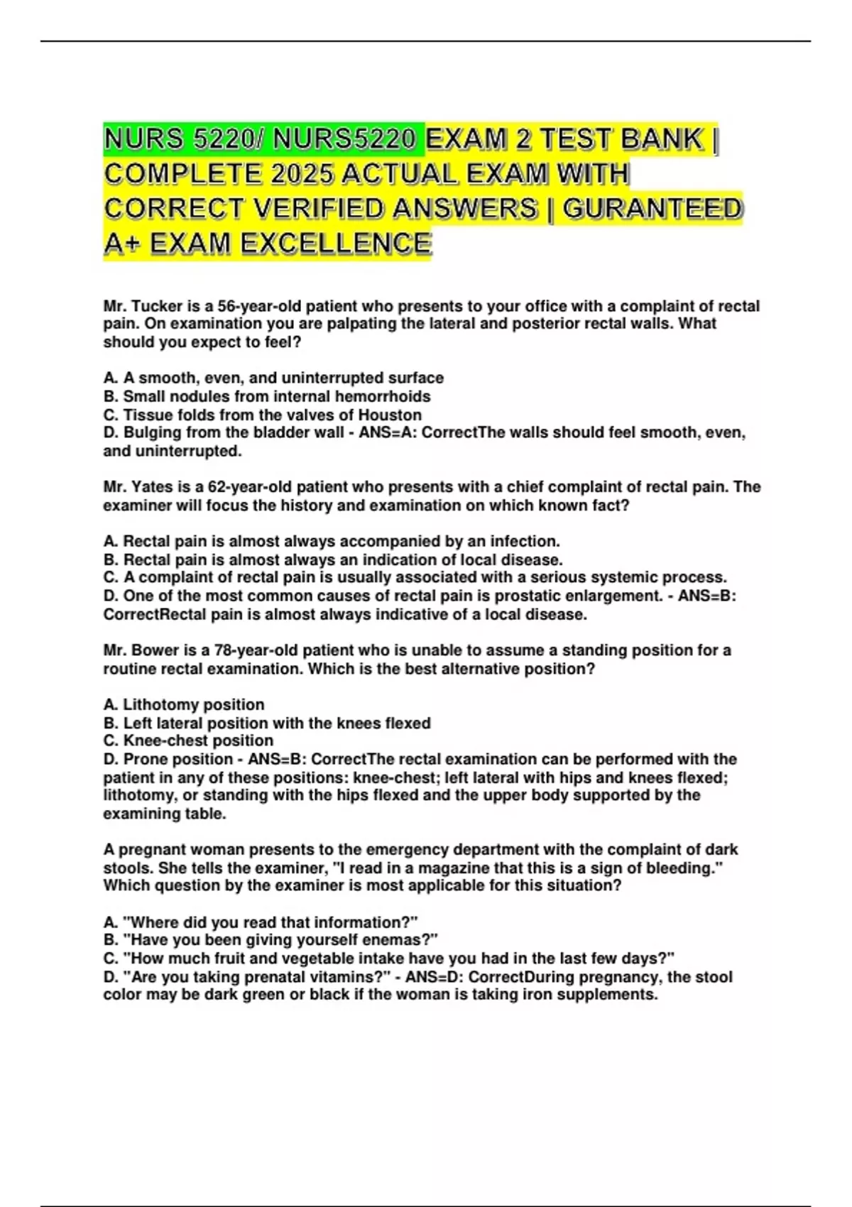D. One of the most common causes of rectal pain is prostatic enlargement. - ANS=B: