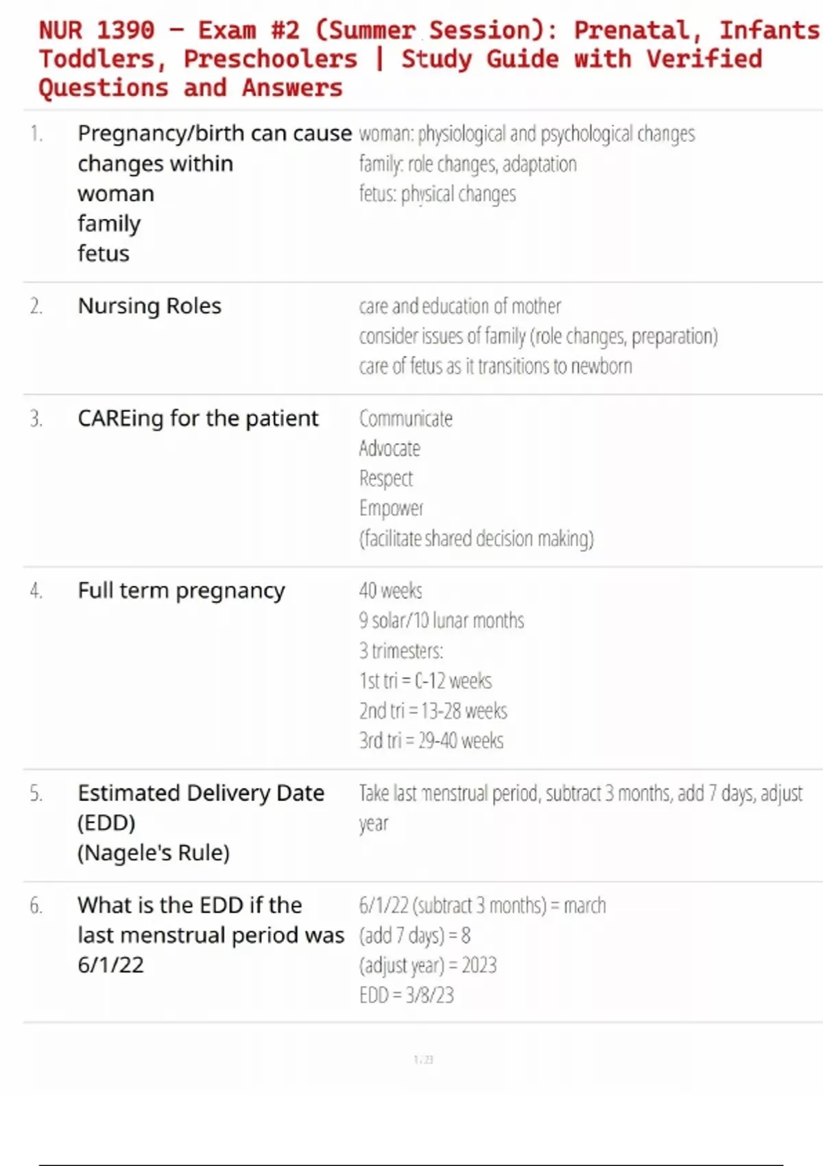 NUR 1390 – Exam #2 (Summer Session): Prenatal, Infants, Toddlers, Preschoolers | Study Guide with Verified Questions and Answers