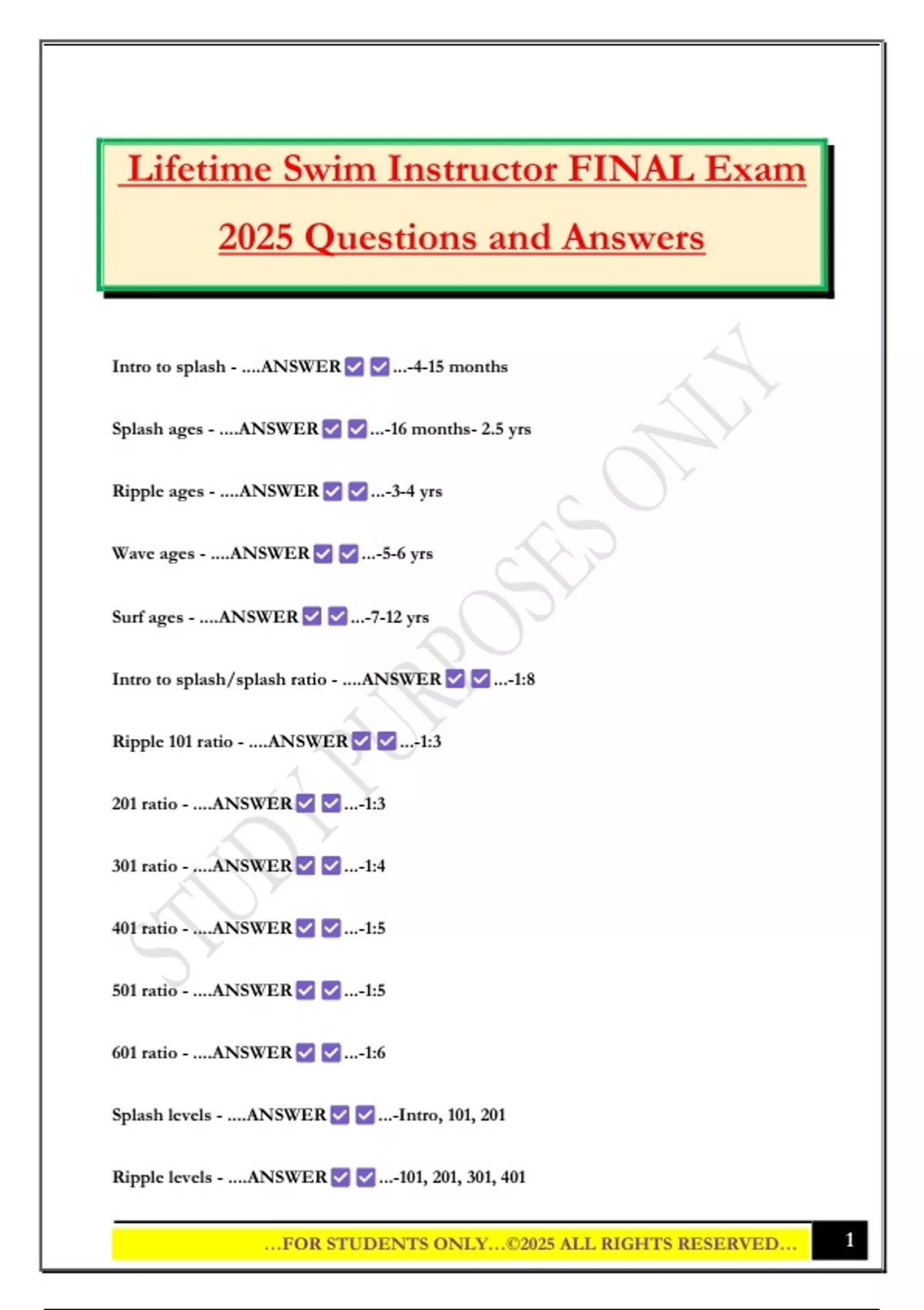 Lifetime Swim Instructor FINAL Exam 2025 Questions and Answers