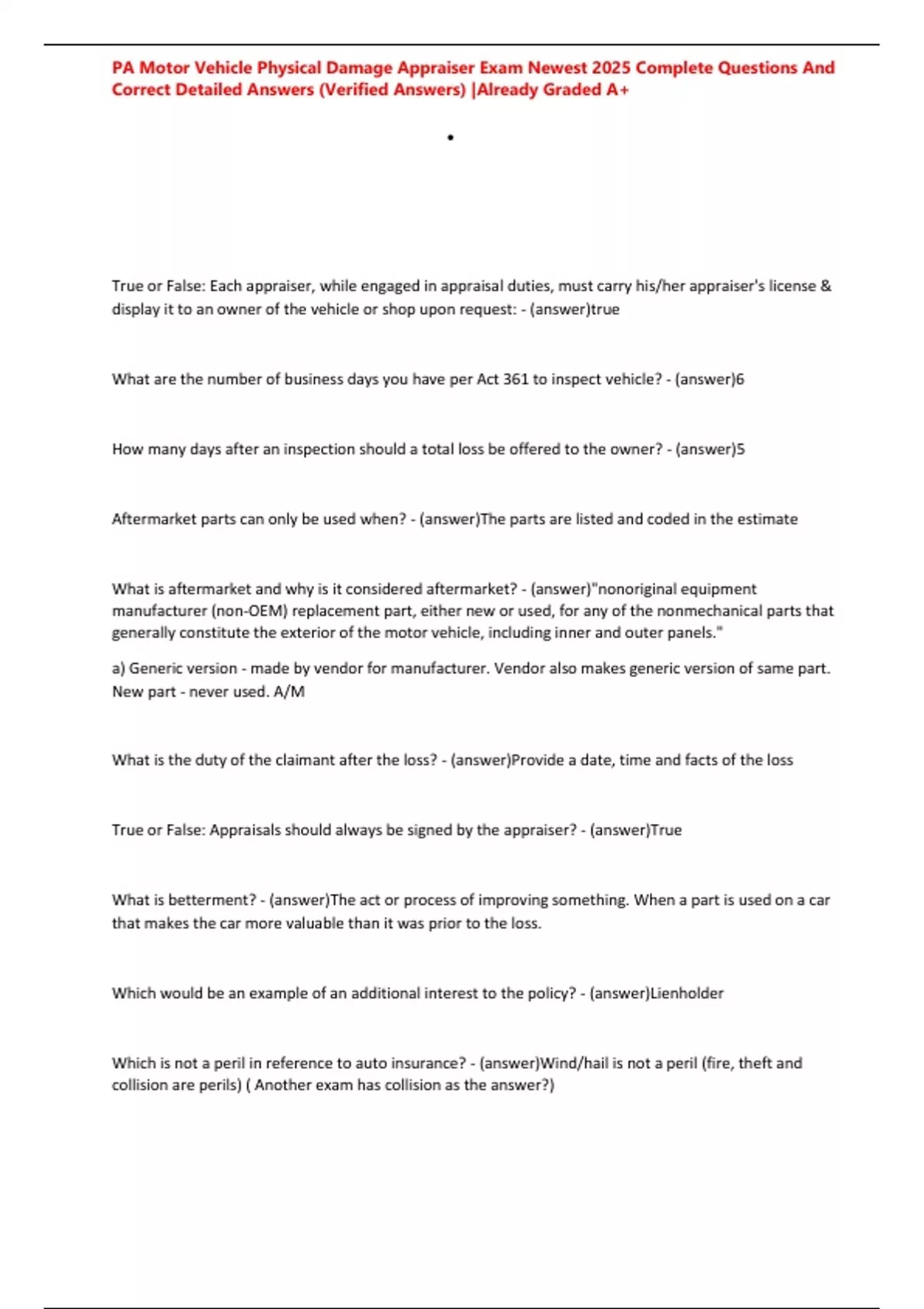 , PA Motor Vehicle Physical Damage Appraiser Exam Newest 2025 Complete Questions And
