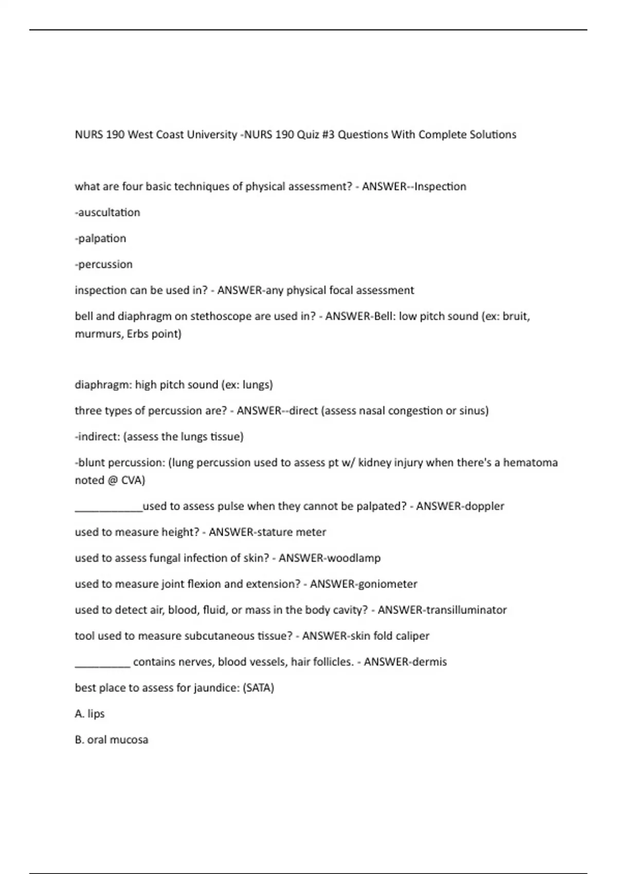 NURS 190 West Coast University -NURS 190 Quiz #3 Questions With Complete Solutions