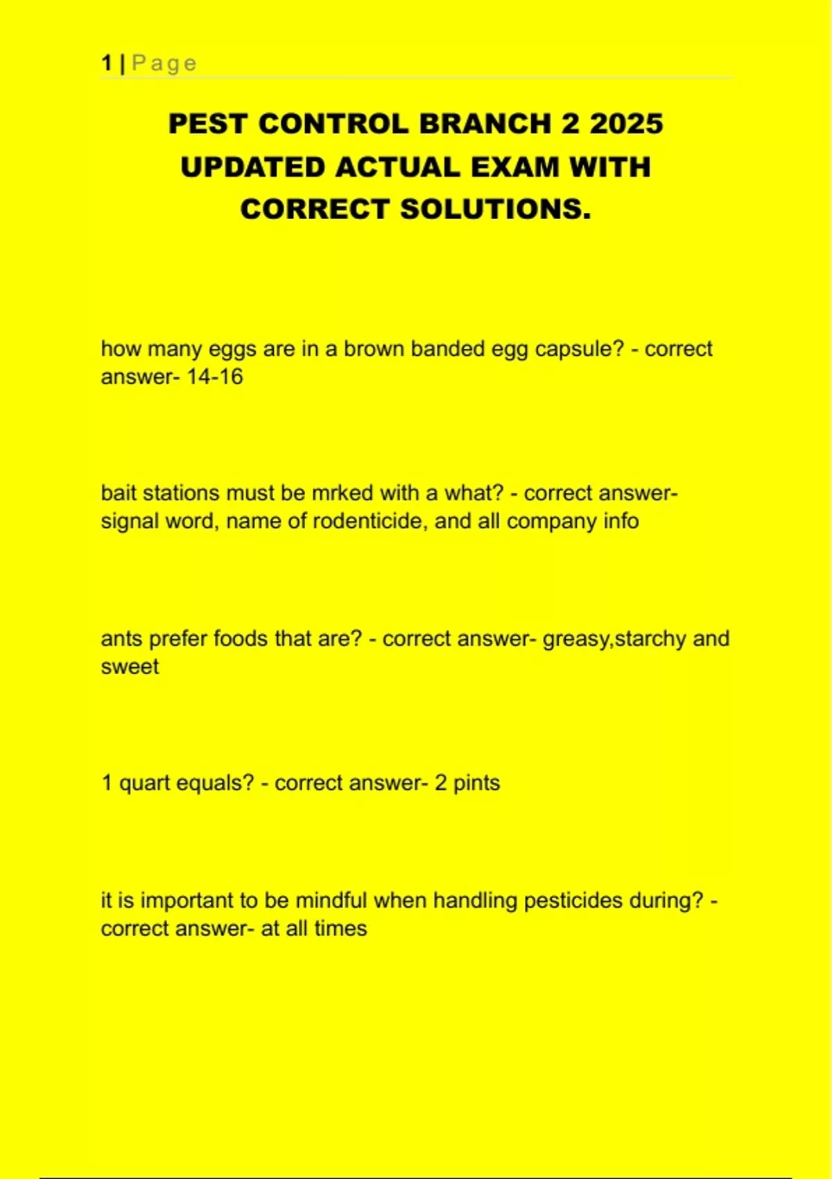 This document presents the fully updated 2025 exam for the California Pest Control Branch 2 license, complete with verified questions and correct answers. It covers rodent and insect pest identification, control methods, pesticide safety, application procedures, legal compliance, equipment handling, and CEU requirements. Topics include cockroach and ant species, flea and fly life cycles, pesticide formulations, integrated pest management (IPM), and inspection protocols. Ideal for those preparing for field representative or applicator certification in structural pest control.