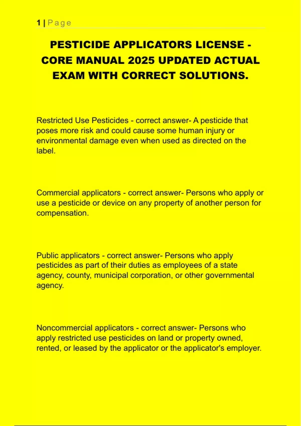 This document presents the 2025 updated Core Manual for the Pesticide Applicators License exam, focusing on glossary terms and concept clarification. It includes accurately defined terms related to pesticide regulation (FIFRA, FFDCA, FQPA), application techniques, hazard awareness (drift, residues, hazardous waste), types of applicators (private, commercial, public), pest management strategies (IPM, cultural, mechanical, biological), and safety protocols (WPS, RCRA). This guide is ideal for anyone preparing for core pesticide certification exams nationwide.
