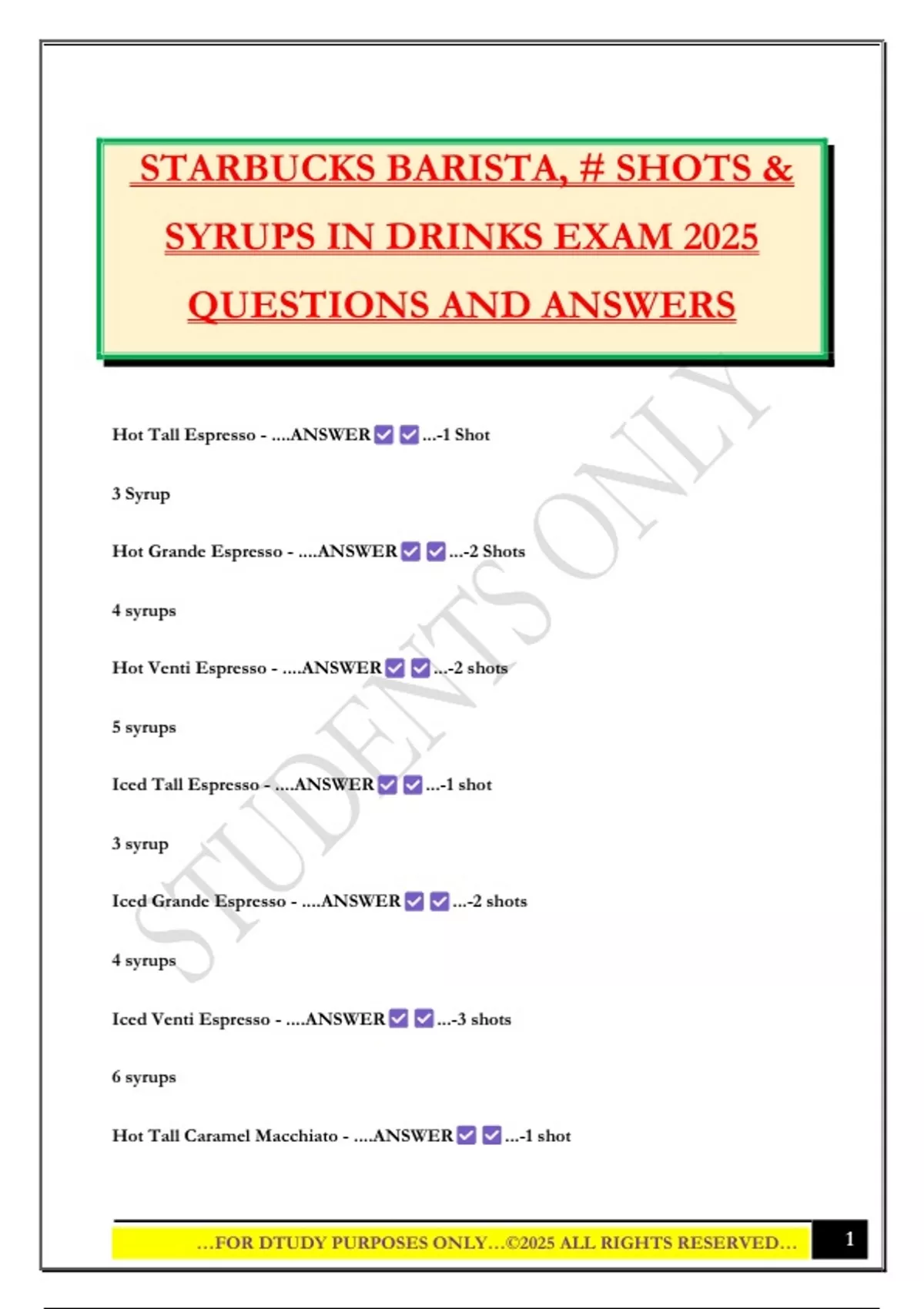 STARBUCKS BARISTA, # SHOTS & SYRUPS IN DRINKS EXAM 2025 QUESTIONS AND ANSWERS