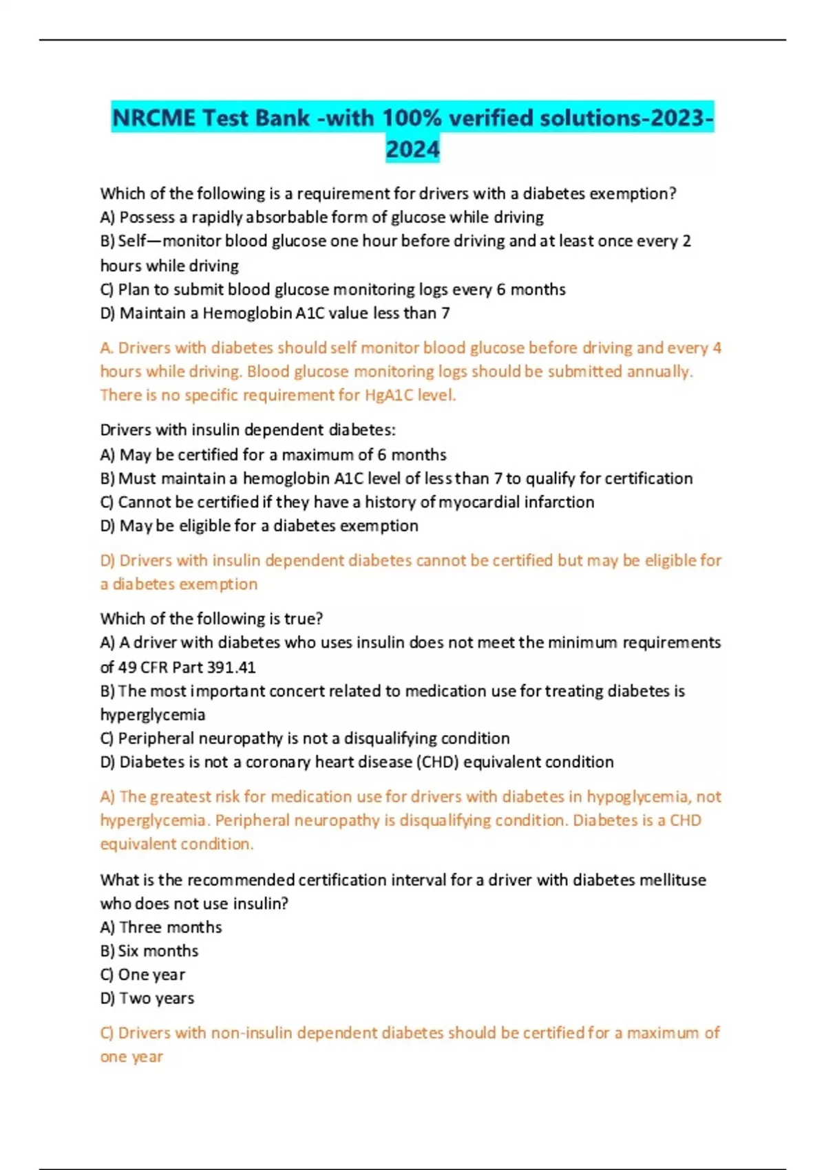 Fully updated NRCME Test Bank 2025 with 100 verified questions and solutions for the FMCSA Medical Examiner Certification exam. Includes DOT physical standards, medical guidelines, disqualification criteria, and case-based scenarios with rationales. Ideal for nurse practitioners, physicians, and PAs preparing for certification or recertification. Download now on Stuvia for accurate, exam-level NRCME prep tailored to 2025 guidelines.