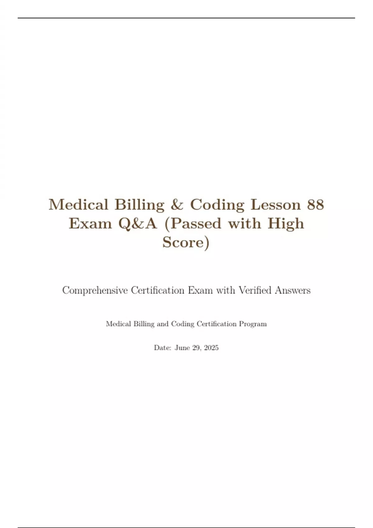 Medical Billing & Coding Lesson 88 Exam Q&A (Passed with High Score) Comprehensive Certification Exam with Verified Answers Medical Billing and Coding Certification Program Date: June 29, 2025