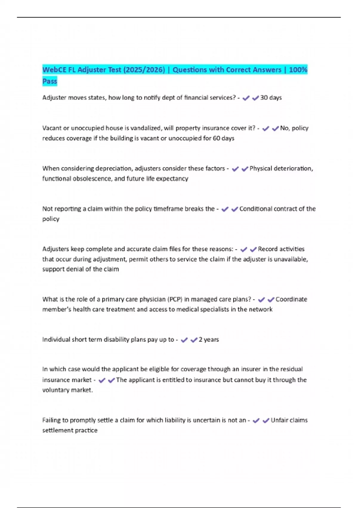 WebCE FL Adjuster Test (2025/2026) | Questions with Correct Answers | 100% Pass