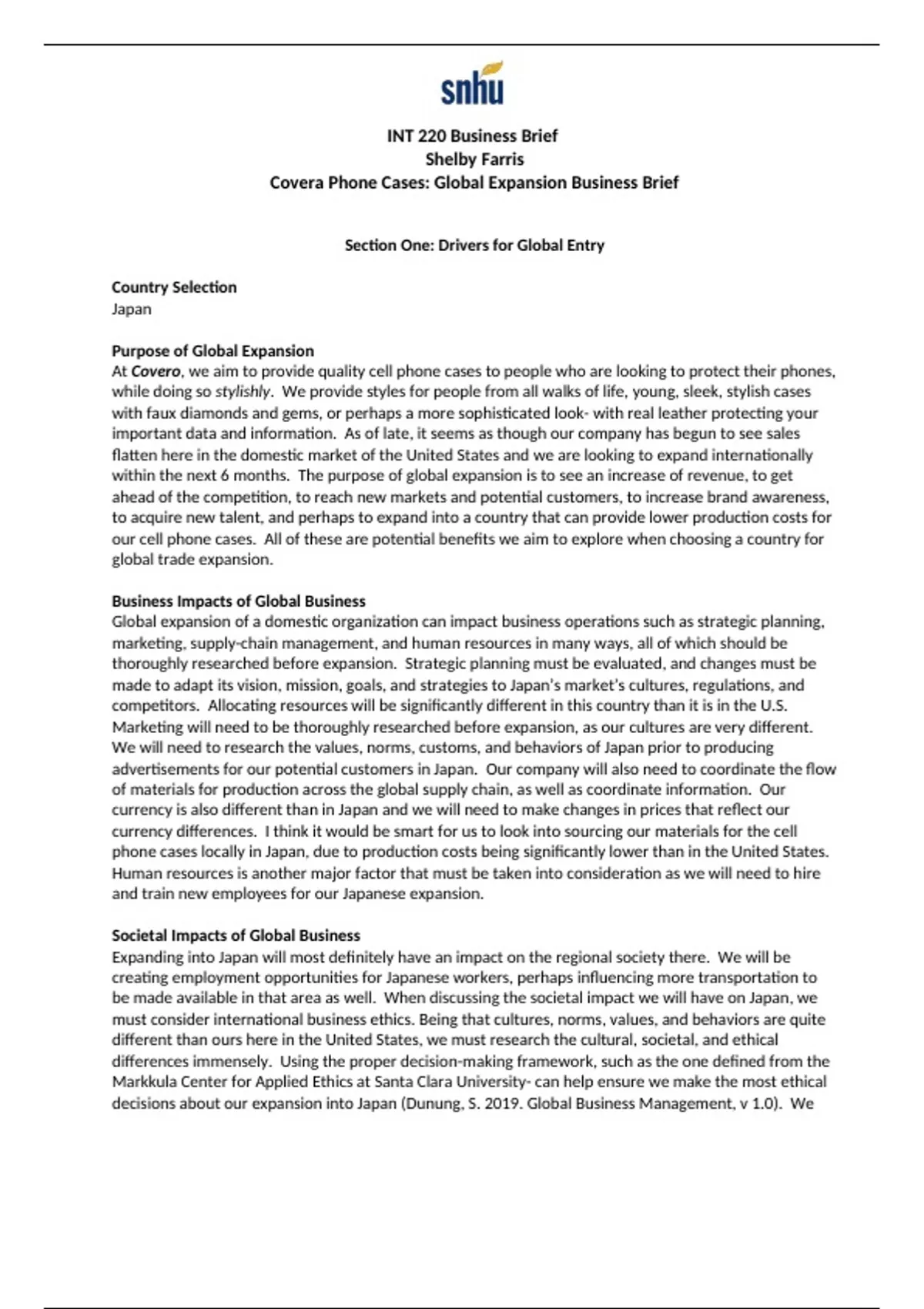 decisions about our expansion into Japan (Dunung, S. 2019. Global Business Management, v 1.0). We