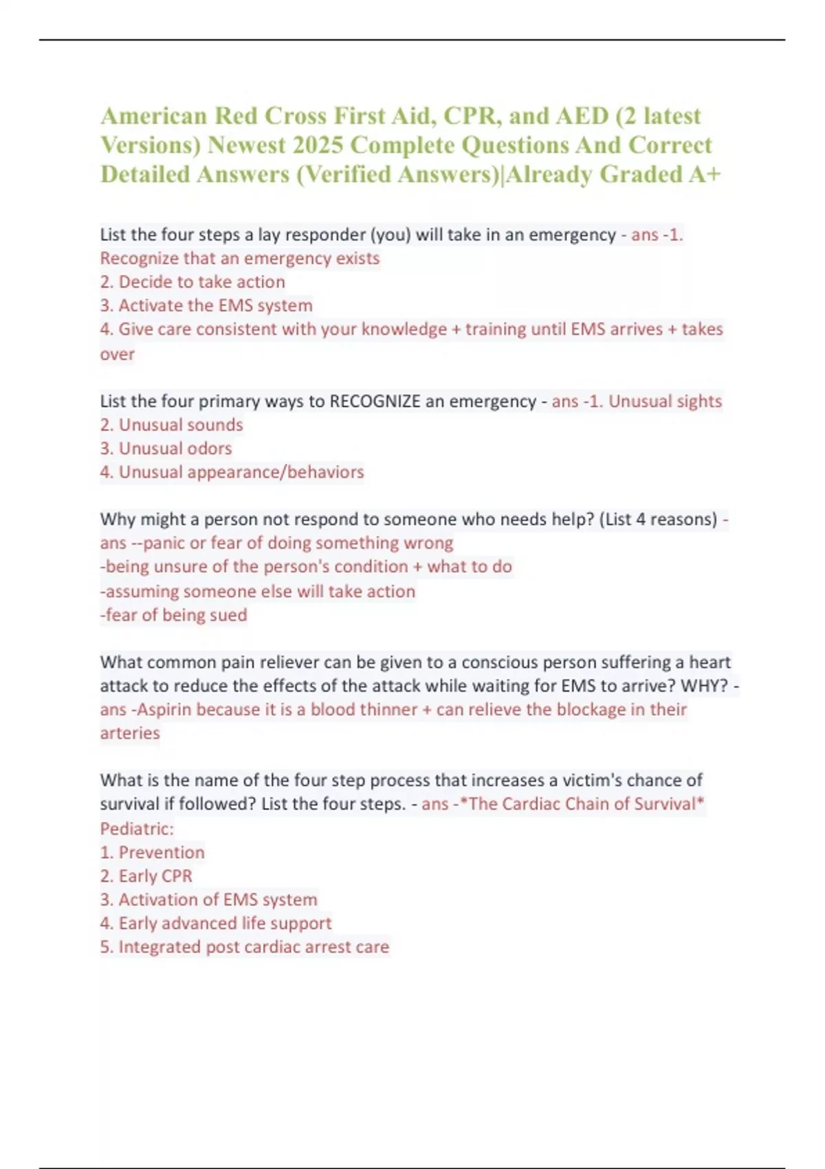American Red Cross First Aid, CPR, and AED (2 latest Versions) Newest 2025 Complete Questions And Correct Detailed Answers (Verified Answers)|Already Graded A+