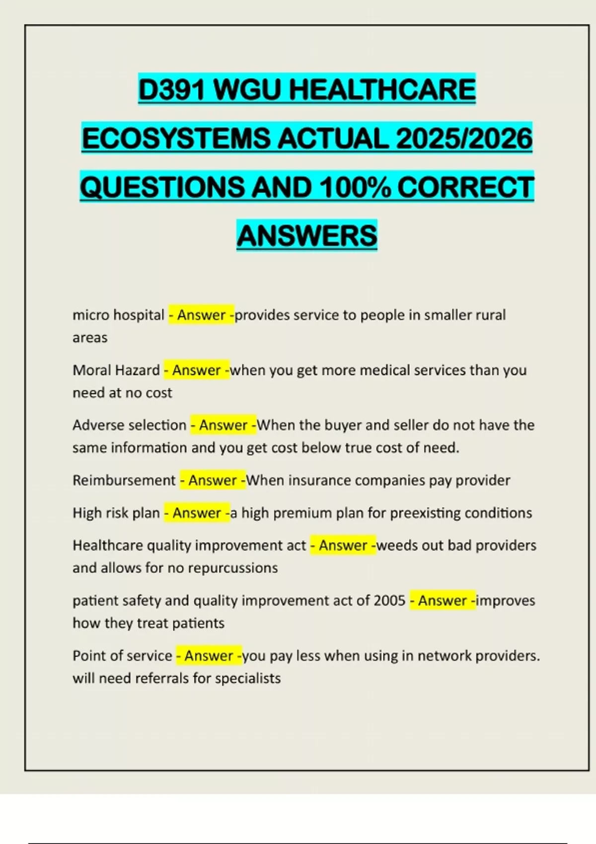D391 WGU HEALTHCARE ECOSYSTEMS ACTUAL 2025/2026 QUESTIONS AND 100% CORRECT ANSWERS micro hospital - Answer -provides service to people in smaller rural areas Moral Hazard - Answer -when you get more medical services than you need at no cost Adverse selection - Answer -When the buyer and seller do not have the same information and you get cost below true cost of need. Reimbursement - Answer -When insurance companies pay provider High risk plan - Answer -a high premium plan for preexisting conditions Healthcare quality improvement act - Answer -weeds out bad providers and allows for no repurcussions patient safety and quality improvement act of 2005 - Answer -improves how they treat patients Point of service - Answer -you pay less when using in network providers. will need referrals for specialistsSTEEEP - Answer -making changes for better quality care. this can also stop a change to try something else. Plan do study act - Answer -used when making changes or when wanting to Lean - Answer -used to eliminate waste SHARE - Answer -allows provider a