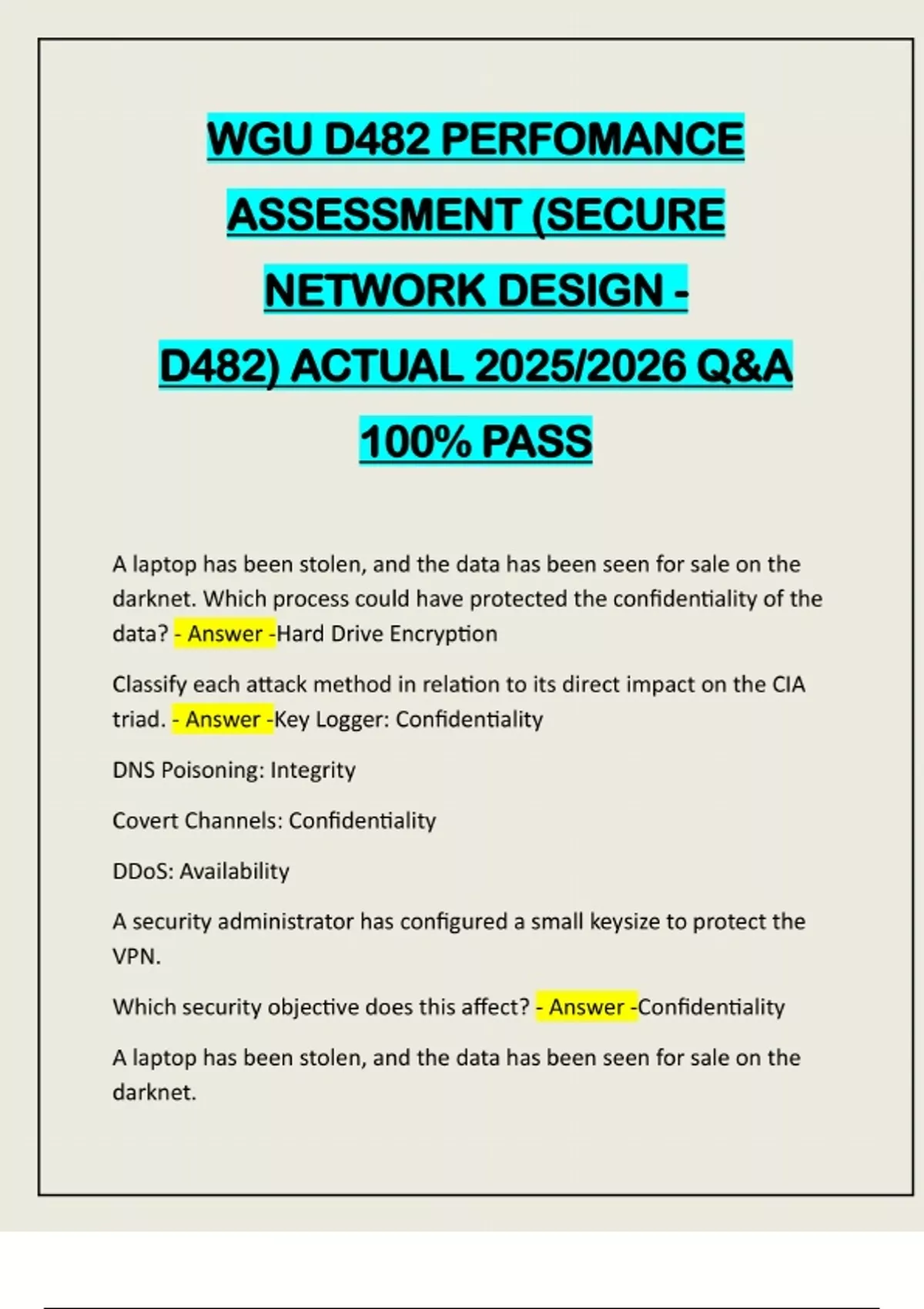 WGU D482 PERFOMANCE ASSESSMENT (SECURE NETWORK DESIGN - D482) ACTUAL 2025/2026 Q&A 100% PASS A laptop has been stolen, and the data has been seen for sale on the darknet. Which process could have protected the confidentiality of the data? - Answer -Hard Drive Encryption Classify each attack method in relation to its direct impact on the CIA triad. - Answer -Key Logger: Confidentiality DNS Poisoning: Integrity Covert Channels: Confidentiality DDoS: Availability A security administrator has configured a small keysize to protect the VPN. Which security objective does this affect? - Answer -Confidentiality A laptop has been stolen, and the data has been seen for sale on the darknet.Which process could have protected the confidentiality of the data? - Answer -Hard Drive encryption When browsing to a financial website, a user receives an error on the browser that points to the certificate on the website. The user reviews the certificate and maps it to a known certificate authority. Why did the user need to perform these actions? - Answer -To establish a trust relationship A team of scientists is working on a secure project. The network administrator needs to configure a network for the team that is not routable from the Internet. A firewall is protecting the scientists' network and is using network address translation (NAT) to translate the internal IP addresses to public IP addresses. Which IP address should the netw