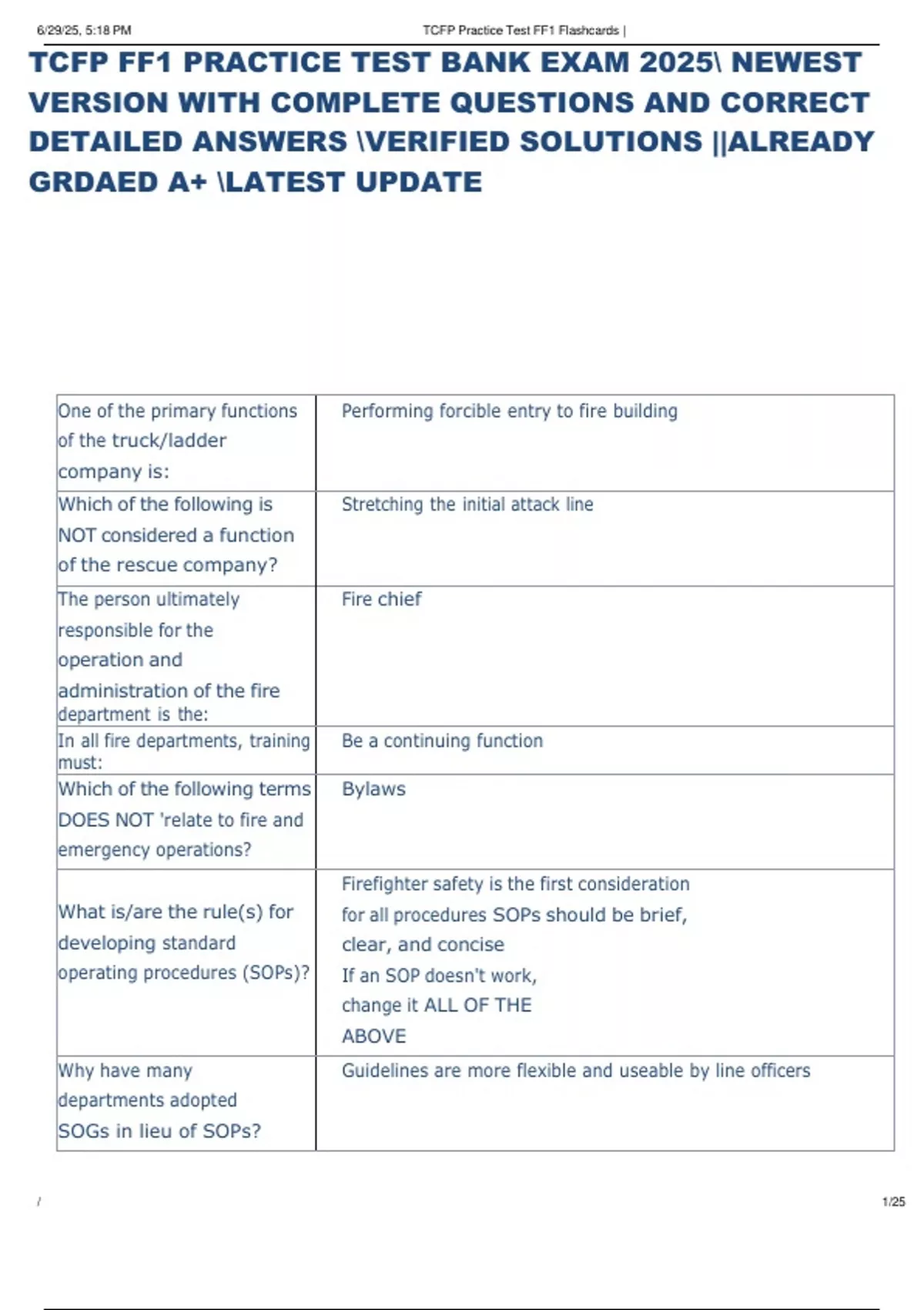 TCFP FF1 PRACTICE TEST BANK EXAM 2025 NEWEST VERSION WITH COMPLETE QUESTIONS AND CORRECT DETAILED ANSWERS VERIFIED SOLUTIONS ||ALREADY GRDAED A+ LATEST UPDATE TCFP FF1 PRACTICE TEST BANK EXAM 2025 NEWEST VERSION WITH COMPLETE QUESTIONS AND CORRECT DETAILED ANSWERS VERIFIED SOLUTIONS ||ALREADY GRDAED A+ LATEST UPDATE TCFP FF1 PRACTICE TEST BANK EXAM 2025 NEWEST VERSION WITH COMPLETE QUESTIONS AND CORRECT DETAILED ANSWERS VERIFIED SOLUTIONS ||ALREADY GRDAED A+ LATEST UPDATE TCFP FF1 PRACTICE TEST BANK EXAM 2025 NEWEST VERSION WITH COMPLETE QUESTIONS AND CORRECT DETAILED ANSWERS VERIFIED SOLUTIONS ||ALREADY GRDAED A+ LATEST UPDATE TCFP FF1 PRACTICE TEST BANK EXAM 2025 NEWEST VERSION WITH COMPLETE QUESTIONS AND CORRECT DETAILED ANSWERS VERIFIED SOLUTIONS ||ALREADY GRDAED A+ LATEST UPDATE TCFP FF1 PRACTICE TEST BANK EXAM 2025 NEWEST VERSION WITH COMPLETE QUESTIONS AND CORRECT DETAILED ANSWERS VERIFIED SOLUTIONS ||ALREADY GRDAED A+ LATEST UPDATE TCFP FF1 PRACTICE TEST BANK EXAM 2025 NEWEST VERSION WITH COMPLETE QUESTIONS AND CORRECT DETAILED ANSWERS VERIFIED SOLUTIONS ||ALREADY GRDAED A+ LATEST UPDATE TCFP FF1 PRACTICE TEST BANK EXAM 2025 NEWEST VERSION WITH COMPLETE QUESTIONS AND CORRECT DETAILED ANSWERS VERIFIED SOLUTIONS ||ALREADY GRDAED A+ LATEST UPDATE TCFP FF1 PRACTICE TEST BANK EXAM 2025 NEWEST VERSION WITH COMPLETE QUESTIONS AND CORRECT DETAILED ANSWERS VERIFIED SOLUTIONS ||ALREADY GRDAED A+ LATEST UPDATE TCFP FF1 PRACTICE TEST BANK EXAM 2025 NEWEST VERSION WITH COMPLETE QUESTIONS AND CORRECT DETAILED ANSWERS VERIFIED SOLUTIONS ||ALREADY GRDAED A+ LATEST UPDATE TCFP FF1 PRACTICE TEST BANK EXAM 2025 NEWEST VERSION WITH COMPLETE QUESTIONS AND CORRECT DETAILED ANSWERS VERIFIED SOLUTIONS ||ALREADY GRDAED A+ LATEST UPDATE TCFP FF1 PRACTICE TEST BANK EXAM 2025 NEWEST VERSION WITH COMPLETE QUESTIONS AND CORRECT DETAILED ANSWERS VERIFIED SOLUTIONS ||ALREADY GRDAED A+ LATEST UPDATE TCFP FF1 PRACTICE TEST BANK EXAM 2025 NEWEST VERSION WITH COMPLETE QUESTIONS AND CORRECT DETAILED ANSWERS VERIFIED SOLUTIONS ||ALREADY GRDAED A+ LATEST UPDATE TCFP FF1 PRACTICE TEST BANK EXAM 2025 NEWEST VERSION WITH COMPLETE QUESTIONS AND CORRECT DETAILED ANSWERS VERIFIED SOLUTIONS ||ALREADY GRDAED A+ LATEST UPDATE TCFP FF1 PRACTICE TEST BANK EXAM 2025 NEWEST VERSION WITH COMPLETE QUESTIONS AND CORRECT DETAILED ANSWERS VERIFIED SOLUTIONS ||ALREADY GRDAED A+ LATEST UPDATE