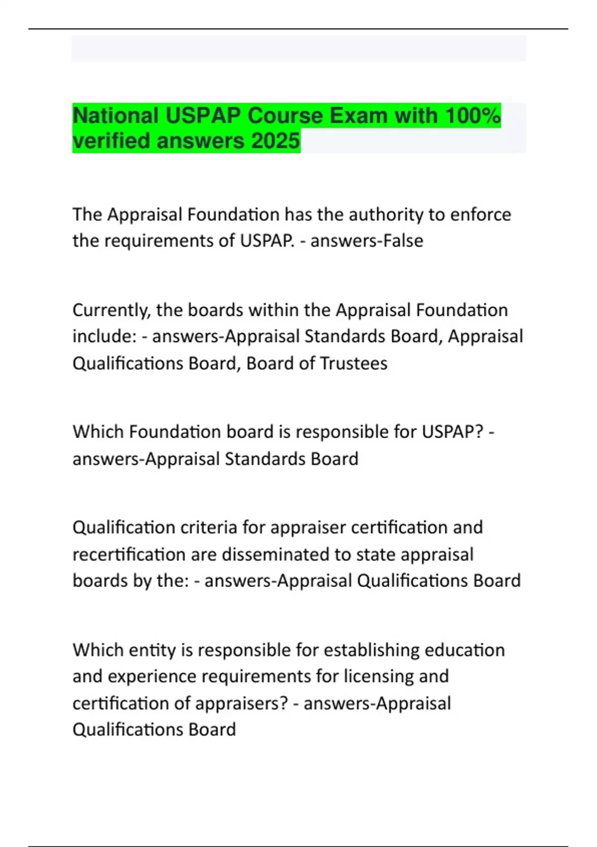 This document provides the full set of questions and 100% verified answers for the 2025 National USPAP (Uniform Standards of Professional Appraisal Practice) Course Exam. It covers key principles such as appraisal ethics, the Scope of Work Rule, Record Keeping Rule, and Standards 1 and 2. Ideal for appraisers preparing for state certification or renewal, this resource ensures thorough preparation with accurate and updated content.