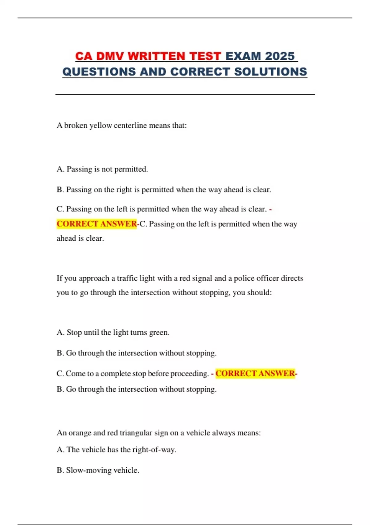 This document contains the full set of updated questions and correct solutions for the 2025 California DMV Written Test. It covers essential topics such as traffic signs, lane markings, right-of-way rules, parking regulations, and safe driving practices in various conditions. Ideal for anyone preparing for the California driver’s license exam, the material provides clear explanations aligned with the latest DMV guidelines.