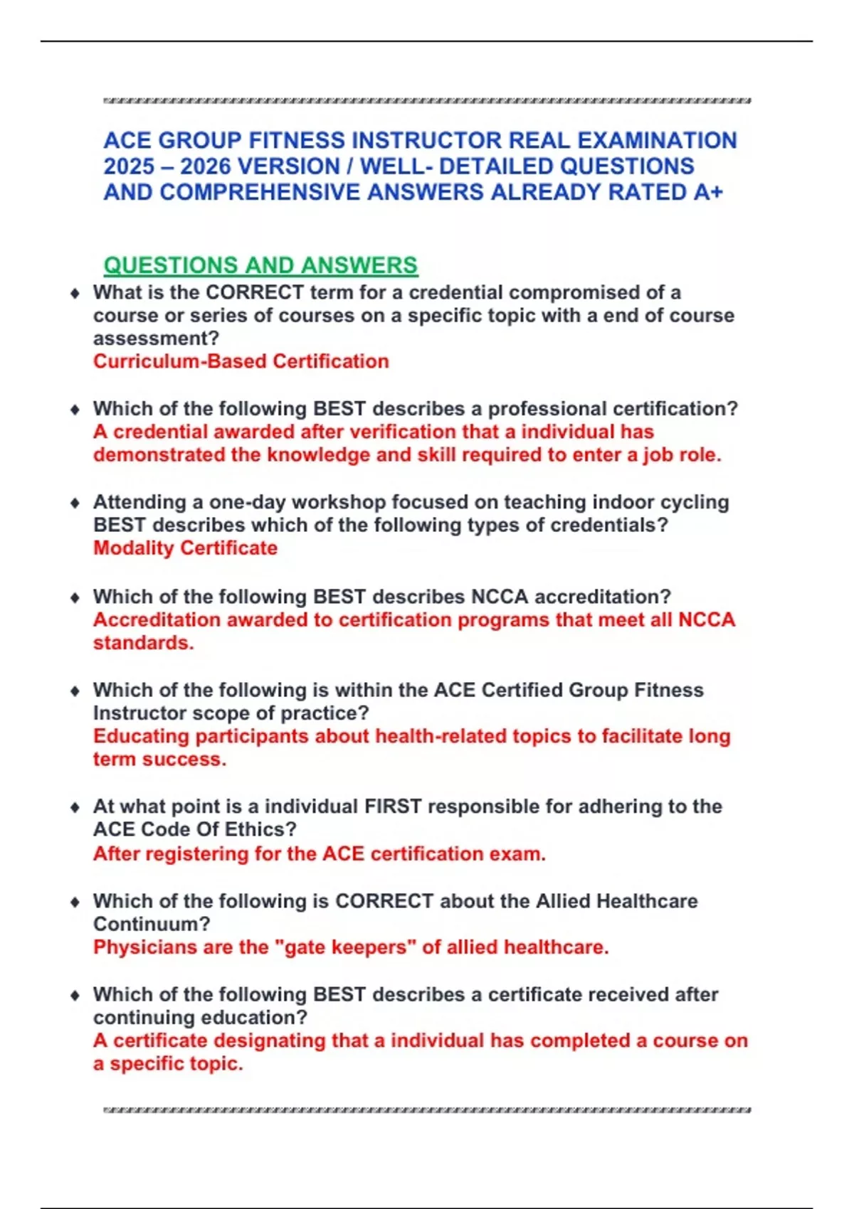 ACE GROUP FITNESS INSTRUCTOR REAL EXAMINATION 2025 – 2026 VERSION / WELL- DETAILED QUESTIONS AND COMPREHENSIVE ANSWERS ALREADY RATED A+