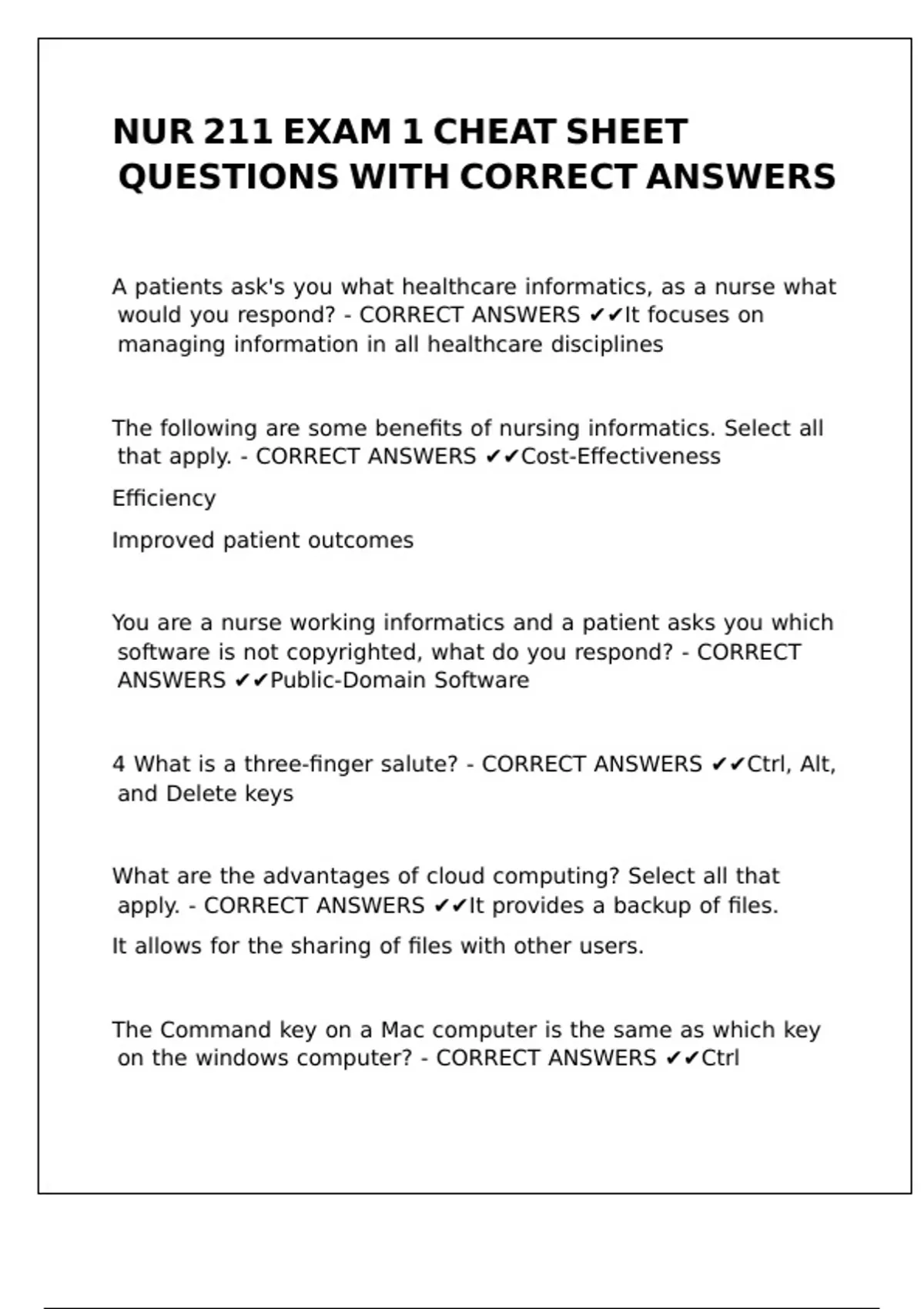 NUR 211 EXAM 1 CHEAT SHEET QUESTIONS WITH CORRECT ANSWERS