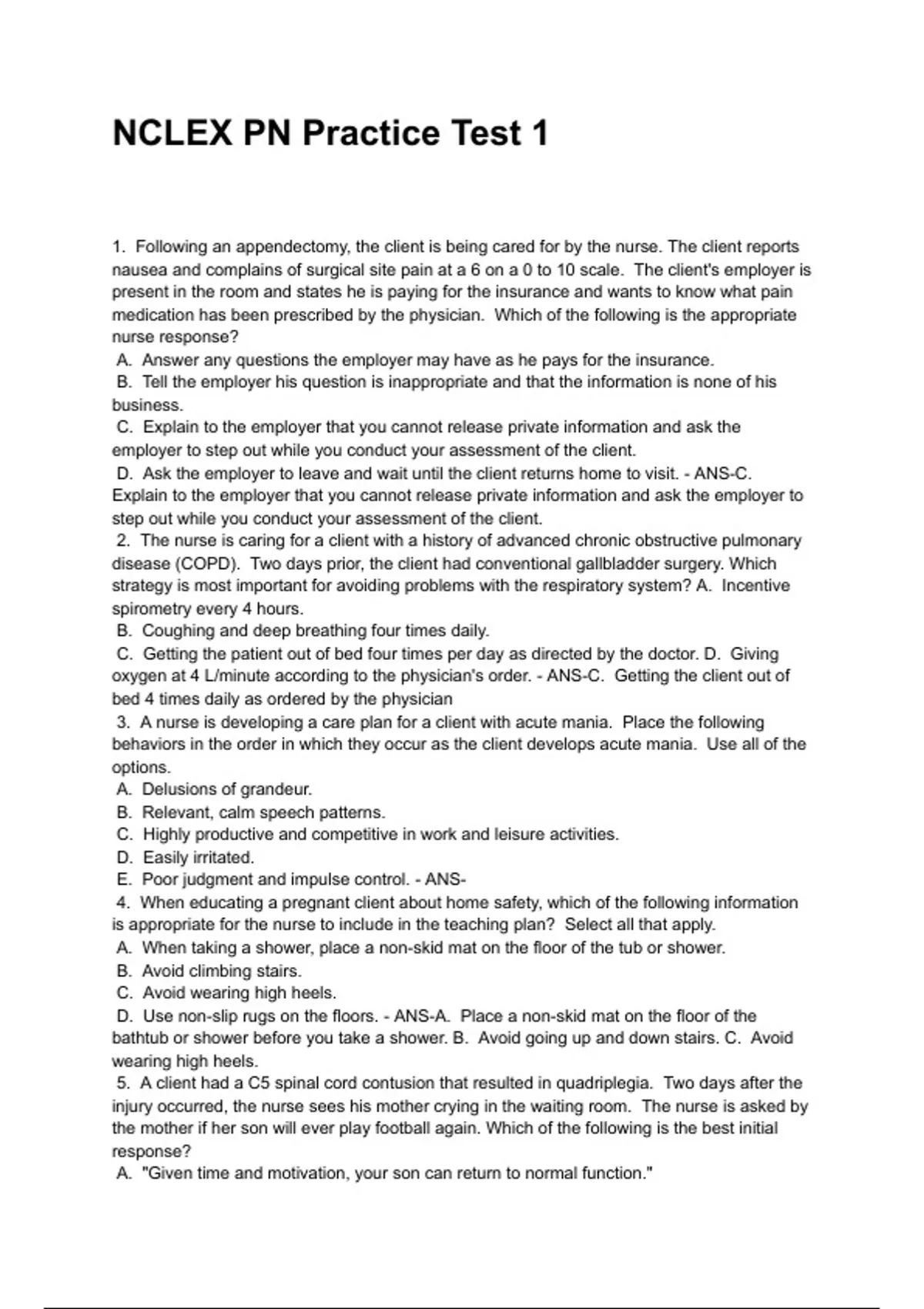 1. Following an appendectomy, the client is being cared for by the nurse. The client reports