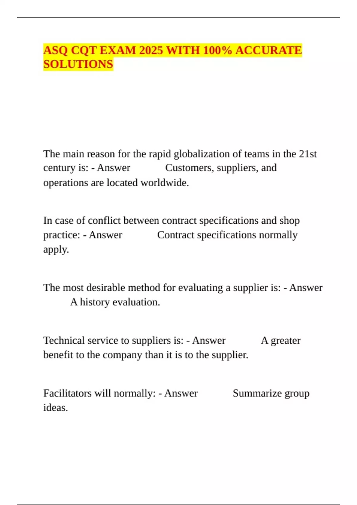 The main reason for the rapid globalization of teams in the 21st century is: - Answer ☑️Customers, suppliers, and operations are located worldwide. In case of conflict between contract specifications and shop practice: - Answer ☑️Contract specifications normally apply. The most desirable method for evaluating a supplier is: - Answer ☑️A history evaluation. Technical service to suppliers is: - Answer ☑️A greater benefit to the company than it is to the supplier. Facilitators will normally: - Answer ☑️Summarize group ideas.