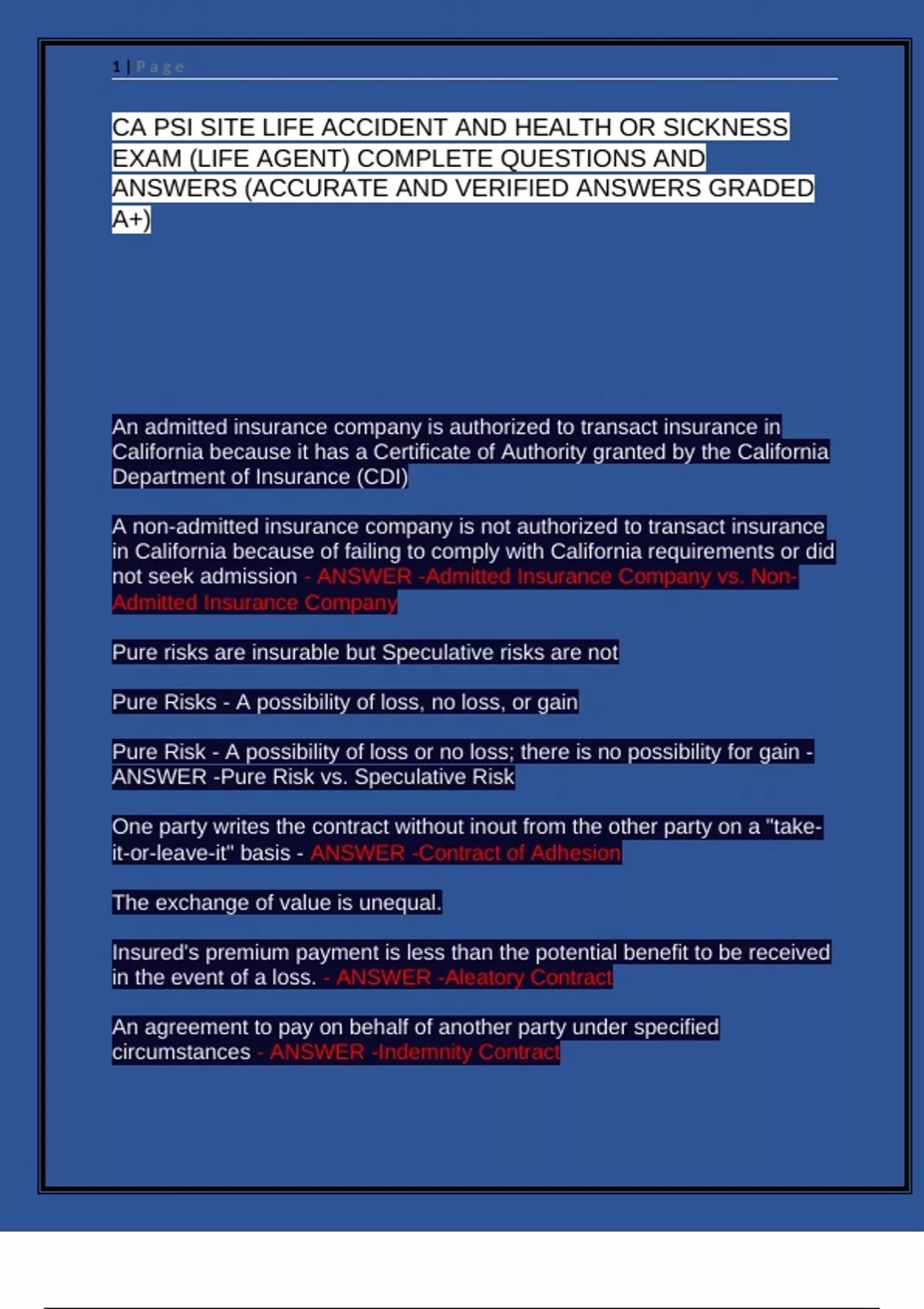 EXAM (LIFE AGENT) COMPLETE QUESTIONS AND