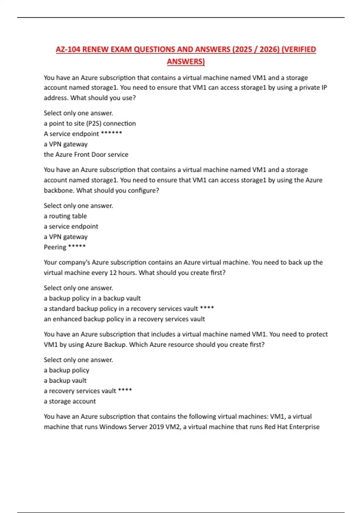 You have an Azure subscription that contains the following virtual machines: VM1, a virtual