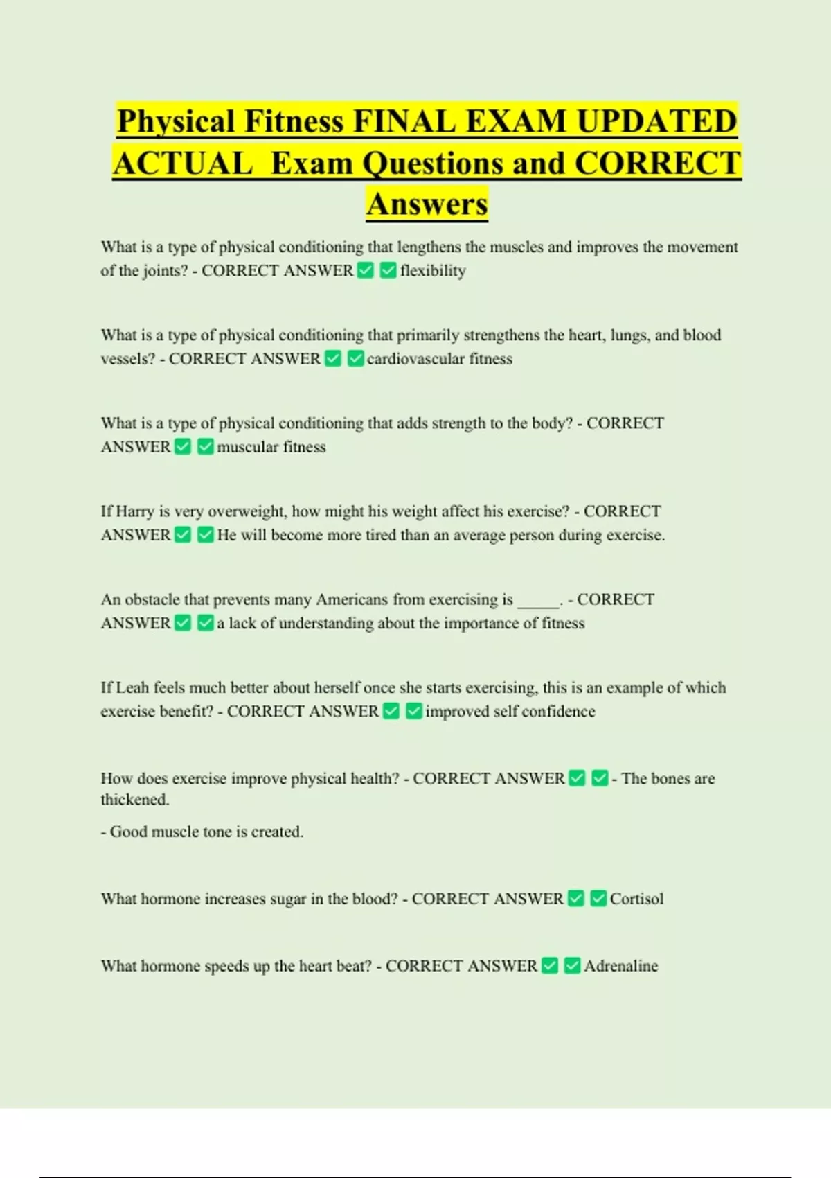 Physical Fitness FINAL EXAM UPDATED ACTUAL Exam Questions and CORRECT Answers What is a type of physical conditioning that lengthens the muscles and improves the movement of the joints? - CORRECT ANSWER flexibility What is a type of physical conditioning that primarily strengthens the heart, lungs, and blood vessels? - CORRECT ANSWER cardiovascular fitness What is a type of physical conditioning that adds strength to the body? - CORRECT ANSWER muscular fitnes
