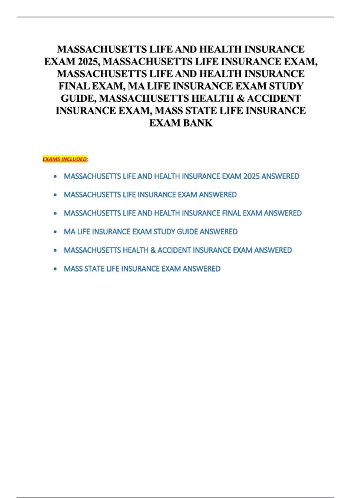 MASSACHUSETTS LIFE AND HEALTH INSURANCE EXAM BUNDLE QUESTIONS & ANSWERS WITH COMPLETE SOLUTIONS 2025/ 2026.