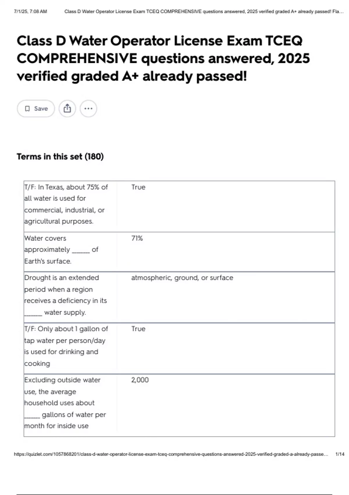 , 7/1/25, 7:08 AM Class D Water Operator License Exam TCEQ COMPREHENSIVE questions answered, 2025 verified graded A+ already passed! Fla…