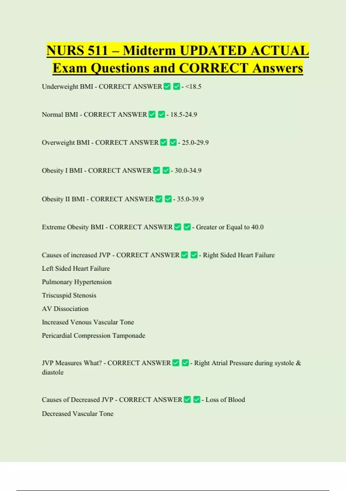 NURS 511 – Midterm UPDATED ACTUAL Exam Questions and CORRECT Answers Underweight BMI - CORRECT ANSWER Normal BMI - CORRECT ANSWER Overweight BMI - CORRECT ANSWER Obesity I BMI - CORRECT ANSWER Obesity II BMI - CORRECT ANSWER Extreme Obesity BMI - CORRECT ANSWER Causes of increased JVP - CORRECT ANSWER Left Sided Heart Failure Pulmonary Hypertension Triscuspid Stenosis AV Dissociation Increased Venous Vascular Tone Pericardial Compression Tamponade JVP Measures What? - CORRECT ANSWER diastole - <18.5 - 18.5-24.9 - 25.0-29.9 - 30.0-34.9 - 35.0-39.9