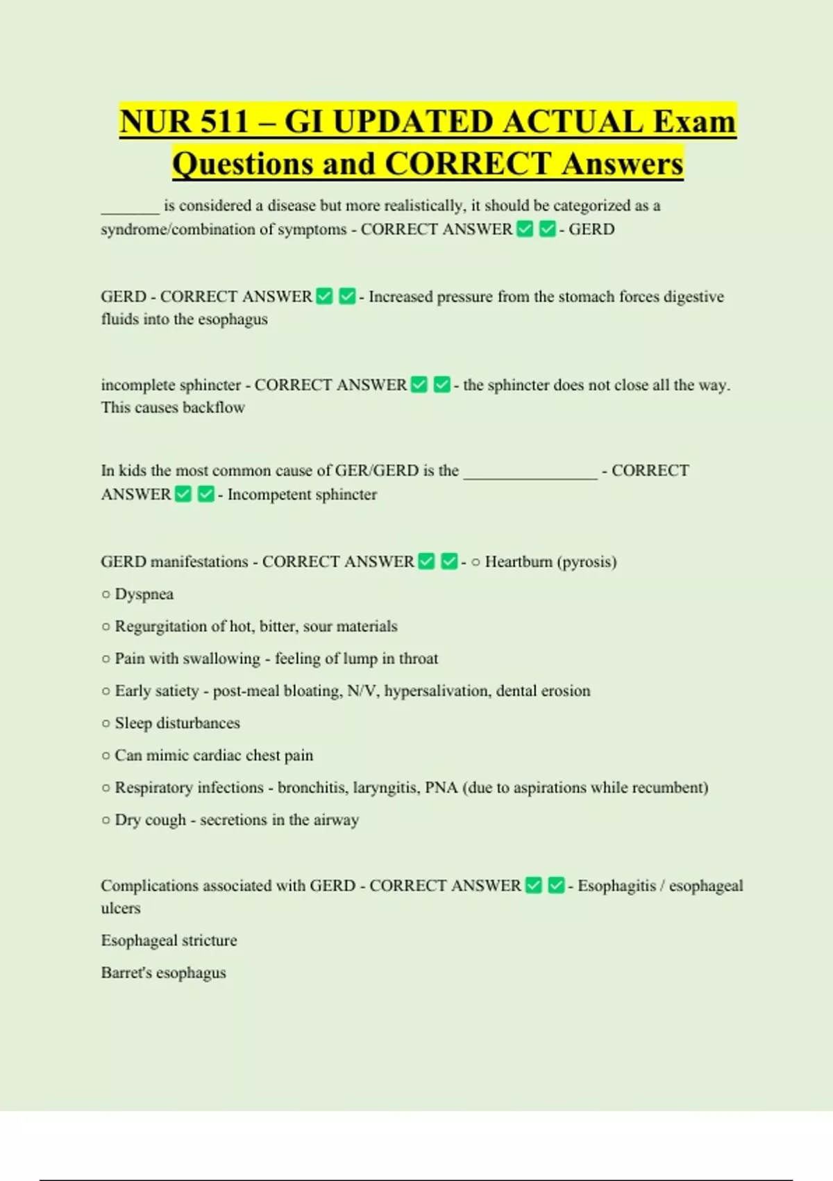 NUR 511 – GI UPDATED ACTUAL Exam Questions and CORRECT Answers _______ is considered a disease but more realistically, it should be categorized as a syndrome/combination of symptoms - CORRECT ANSWER - GERD GERD - CORRECT ANSWER fluids into the esophagus - Increased pressure from the stomach forces digestive incomplete sphincter - CORRECT ANSWER This causes backflow - the sphincter does not close all the way. In kids the most common cause of GER/GERD is the ________________ - CORRECT ANSWER - Incompetent sphincte