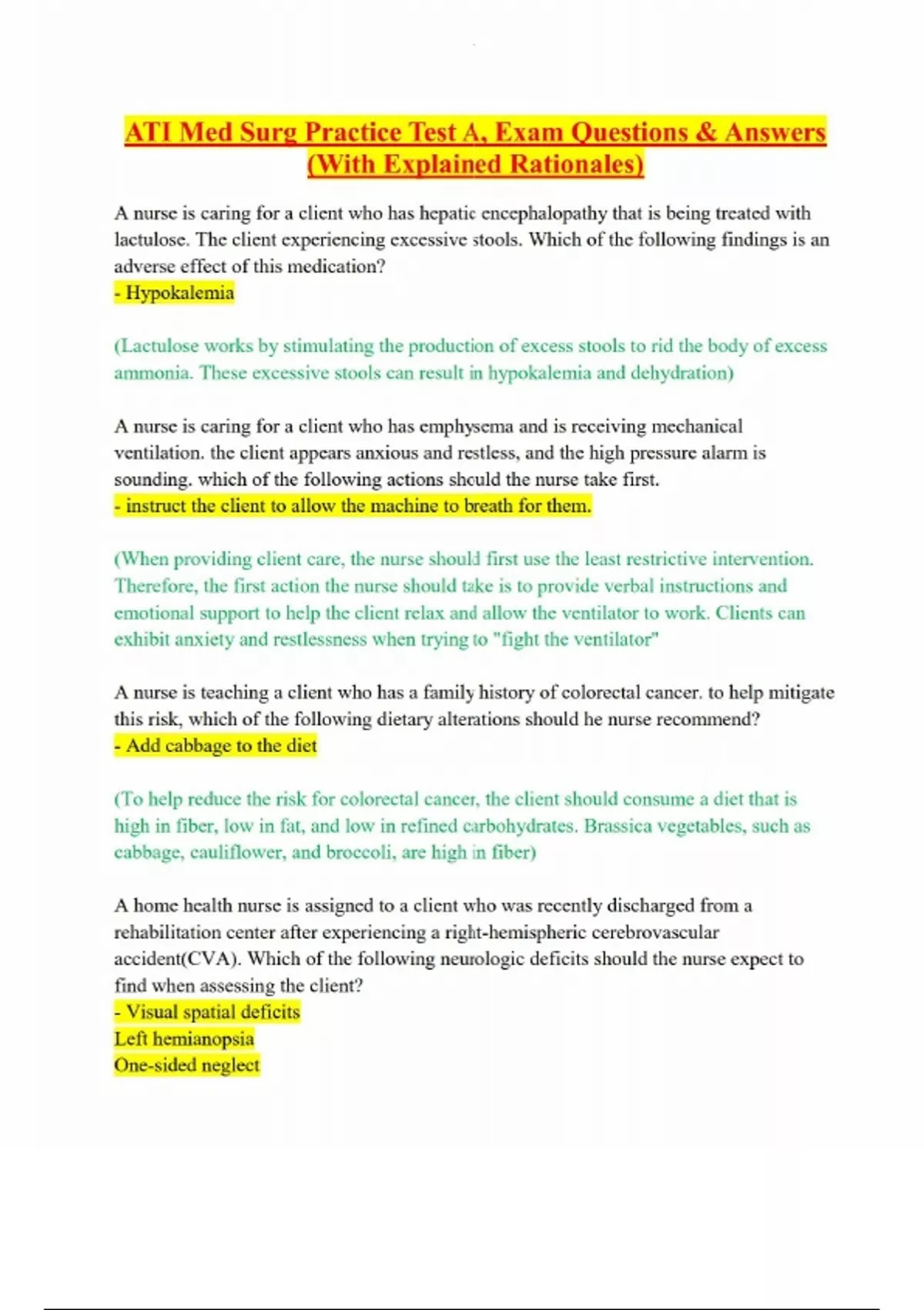 ATI Med Surg Practice Test A, Exam Questions & Answers (With Explained Rationales)-A nurse is caring for a client who has hepatic encephalopathy that is being treated with lactulose. The client experiencing excessive stools. Which of the following findings is an adverse effect of this medication? - Hypokalemia (Lactulose works by stimulating the production of excess stools to rid the body of excess ammonia. These excessive stools can result in hypokalemia and dehydration) A nurse is caring for a client who has emphysema and is receiving mechanical ventilation. the client appears anxious and restless, and the high pressure alarm is sounding. which of the following actions should the nurse take first. - instruct the client to allow the machine to breath for them. (When providing client care, the nurse should first use the least restrictive intervention. Therefore, the first action the nurse should take is to provide verbal instructions and emotional support to help the client relax and allow the ventilator to work. Clients can exhibit anxiety and restlessness when trying to "fight the ventilator" A nurse is teaching a client who has a family history of colorectal cancer. to help mitigate this risk, which of the following dietary alterations should he nurse recommend? - Add cabbage to the diet (To help reduce the risk for colorectal cancer, the client should consume a diet that is high in fiber, low in fat, and low in refined carbohydrates. Brassica vegetables, such as cabbage, cauliflower, and broccoli, are high in fiber) A home health nurse is assigned to a client who was recently discharged from a rehabilitation center after experiencing a right-hemispheric cerebrovascular accident(CVA). Which of the following neurologic deficits should the nurse expect to find when assessing the client? - Visual spatial deficits Left hemianopsia One-sided neglect Visual spatial deficits and loss of depth perception occur secondary to a right-hemispheric stroke Left hemianopsia, or blindness in the left half of the visual field, occurs secondary to a right-hemispheric stroke One-side neglect, or an unawareness of the affected side, occurs secondary to a right-hemispheric stroke A nurse is caring for a client who has viral pneumonia. The client's pulse oximeter readings have fluctuated between 79% and 88% for the last 30 min. Which of the following oxygen delivery systems should the nurse initiate to provide the highest concentration of oxygen? - Nonrebreather mask The nurse should initiate a nonrebreather mask to deliver between 80% to 95% oxygen to the client. A client who has an unstable respiratory status should receive oxygen vis a nonrebreather mask. A nurse is caring for a client who has bilateral pneumonia and a SaO2 of 85%. the client has dyspnea with a productive cough and is using accessory muscles to breath. Which of the following actions should the nurse take first.? - place the patient in high fowlers. The greatest risk to this client is injury from airway obstruction. Therefore, the priority intervention the nurse should take is to move the client into high-Flower's position. High-Flower's position facilitates lung expansion and improved ventilation and gas exchange. A nurse is planning care for a client who has extensive burn injuries and is immunocompromised. which of the following precautions should the nurse include in the plan of care to prevent pseudomonas aeruginosa infection? - Avoid placing plants and flowers in the patients room. Live plants can harbor P. aeruginosa, and this bacterium can infect burn wounds and cause life-threatening complications. The nurse should ensure no one brings live plants or flowers into the client's room An older adult client is brought to an emergency department by a family member. Which of the following assessment findings should cause the nurse to suspect that the client has hypertonic dehydration? - Urine specific gravity is 1.045 A urine specific gravity greater than 1.030 indicated a decrease in urine volume and an increase in osmolarity, which is a manifestation of hypertonic dehydration. Skin turgor is unreliable indication of dehydration RR is to increase if dehydration occurs not decreased a nurse in an emergency department is reviewing the providers prescriptions for a client who sustained a rattlesnake bite to the lower leg. which of the following prescriptions should the nurse expect? - opioid analgesic To promote comfort following a rattlesnake bite Wrong answers: Apply ice for bite from a black widow spider Corticosteroid and antihistamines for stings from bees and wasps Keep affected extremity at heart level, not above or below it