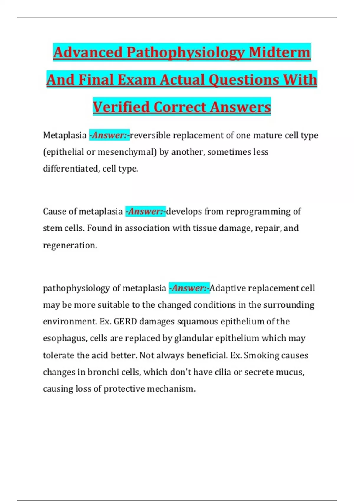 Advanced Pathophysiology Midterm And Final Exam Actual Questions With Verified Correct Answers Metaplasia -Answer:-reversible replacement of one mature cell type (epithelial or mesenchymal) by another, sometimes less differentiated, cell type. Cause of metaplasia -Answer:-develops from reprogramming of stem cells. Found in association with tissue damage, repair, and regeneration. pathophysiology of metaplasia -Answer:-Adaptive replacement cell may be more suitable to the changed conditions in the surrounding environment. Ex. GERD damages squamous epithelium of the esophagus, cells are replaced by glandular epithelium which may tolerate the acid better. Not always beneficial. Ex. Smoking causes changes in bronchi cells, which don't have cilia or secrete mucus, causing loss of protective mechanism.
