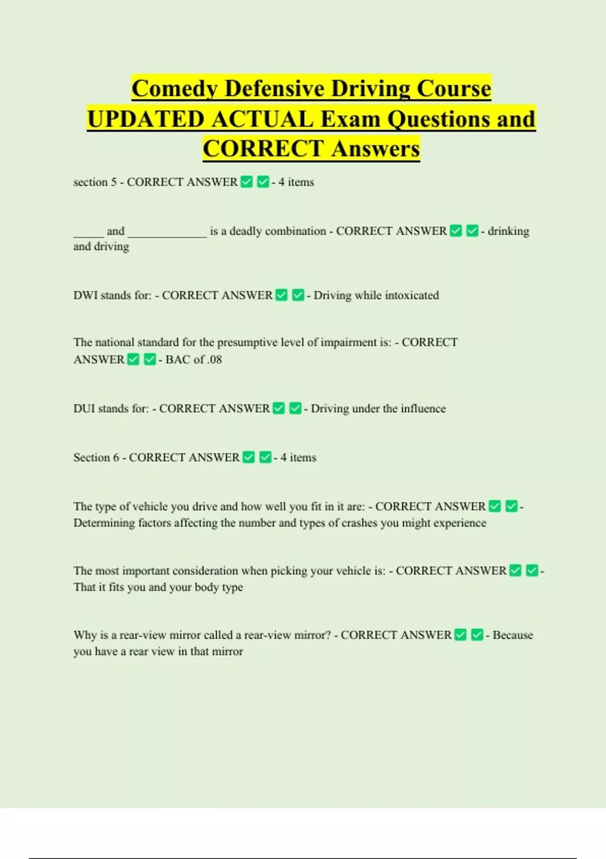 Comedy Defensive Driving Course UPDATED ACTUAL Exam Questions and CORRECT Answers