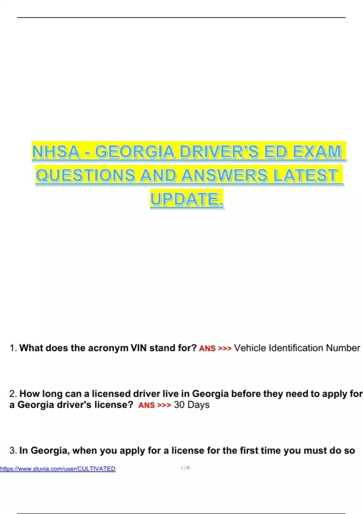 NHSA - GEORGIA DRIVER'S ED EXAM QUESTIONS AND ANSWERS LATEST UPDATE. NHSA - GEORGIA DRIVER'S ED EXAM QUESTIONS AND ANSWERS LATEST UPDATE. NHSA - GEORGIA DRIVER'S ED EXAM QUESTIONS AND ANSWERS LATEST UPDATE.