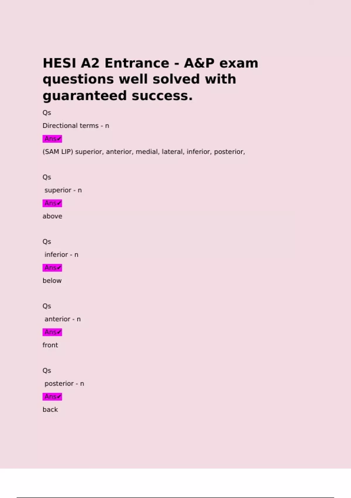 HESI A2 Entrance - A&P exam questions well solved with guaranteed success. Qs Directional terms - n Ans (SAM LIP) superior, anterior, medial, lateral, inferior, posterior, Qs superior - n Ans above Qs inferior - n Ans below Qs anterior - n Ans