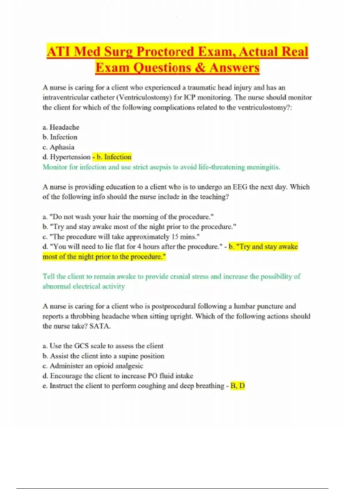 ATI Medical-Surgical Proctored Exam | Latest Real Exam Questions and Correct Answers | 2025 Complete Study Guide-This document contains the most recent and actual ATI Medical-Surgical Proctored Exam questions and verified correct answers. It covers critical topics including neurological disorders, cardiovascular conditions, respiratory care, gastrointestinal interventions, renal issues, and emergency care scenarios. Perfect for students preparing for the ATI Med Surg proctored exam with comprehensive, accurate, and exam-relevant practice.
