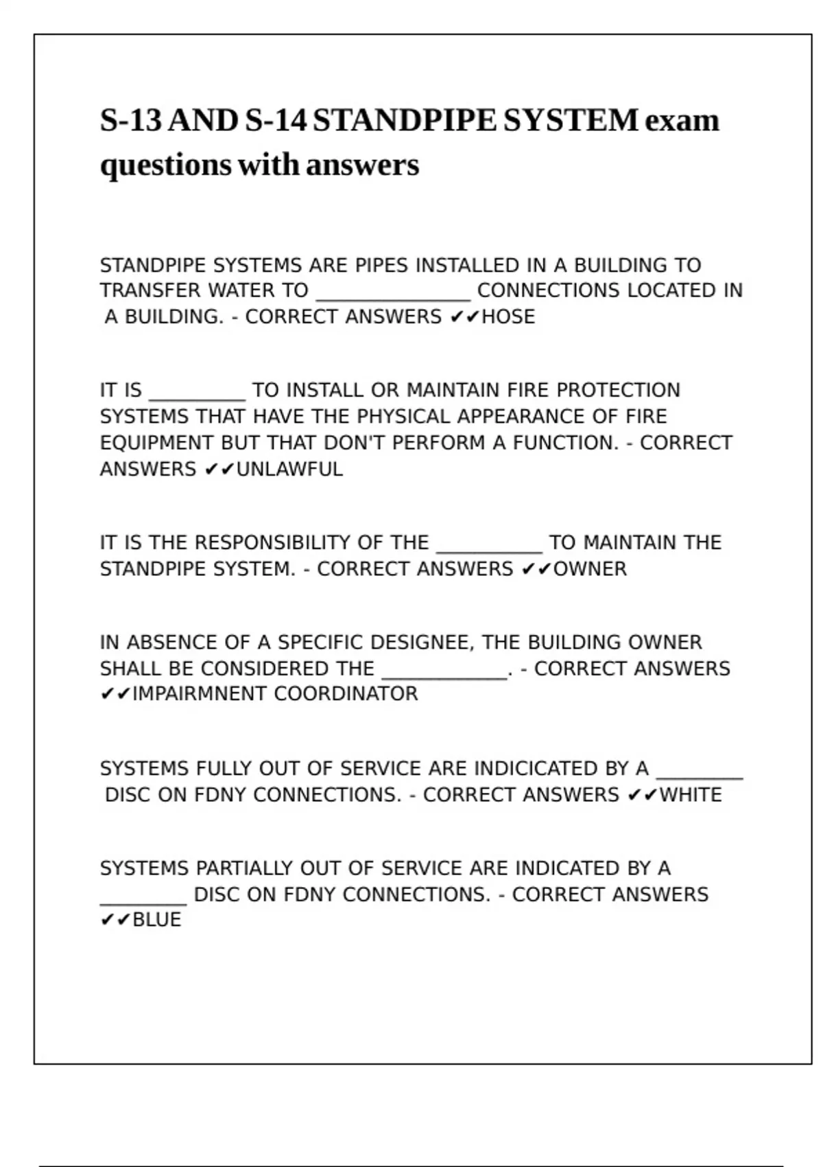STANDPIPE SYSTEM. - CORRECT ANSWERS ✔✔OWNER